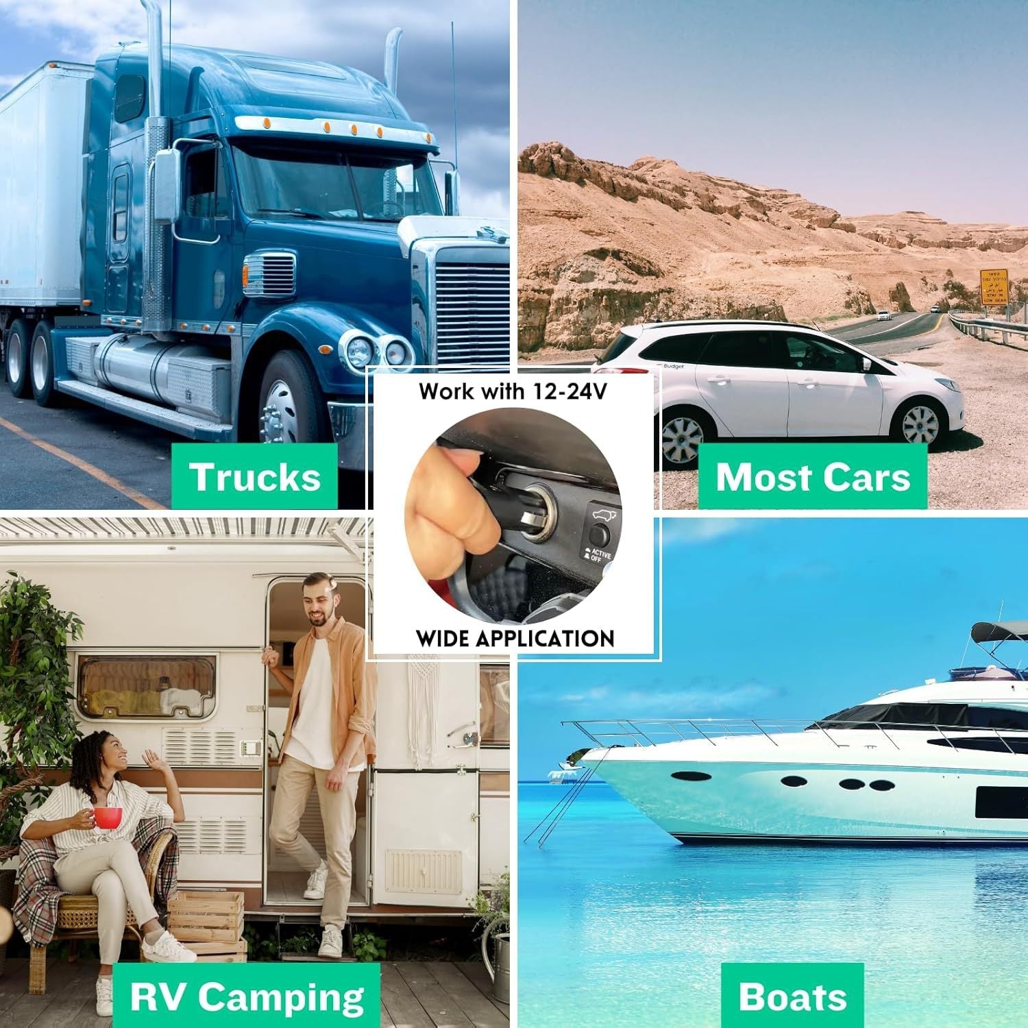 - Universal 12V-24V Compatibility: Works seamlessly with all vehicles featuring 12V or 24V cigarette lighter sockets—cars, trucks, RVs, boats, and campers.