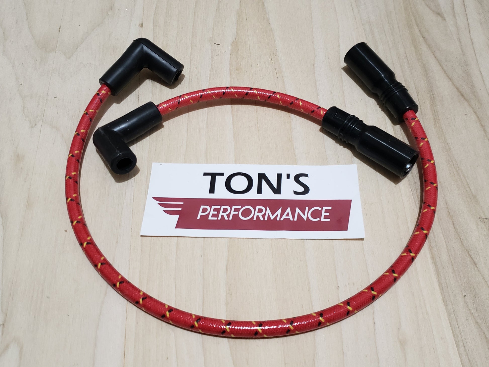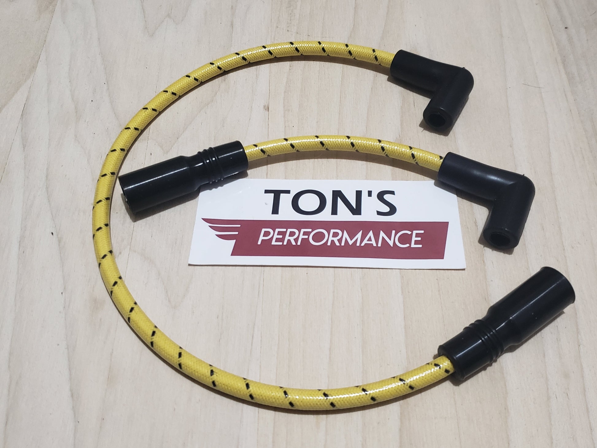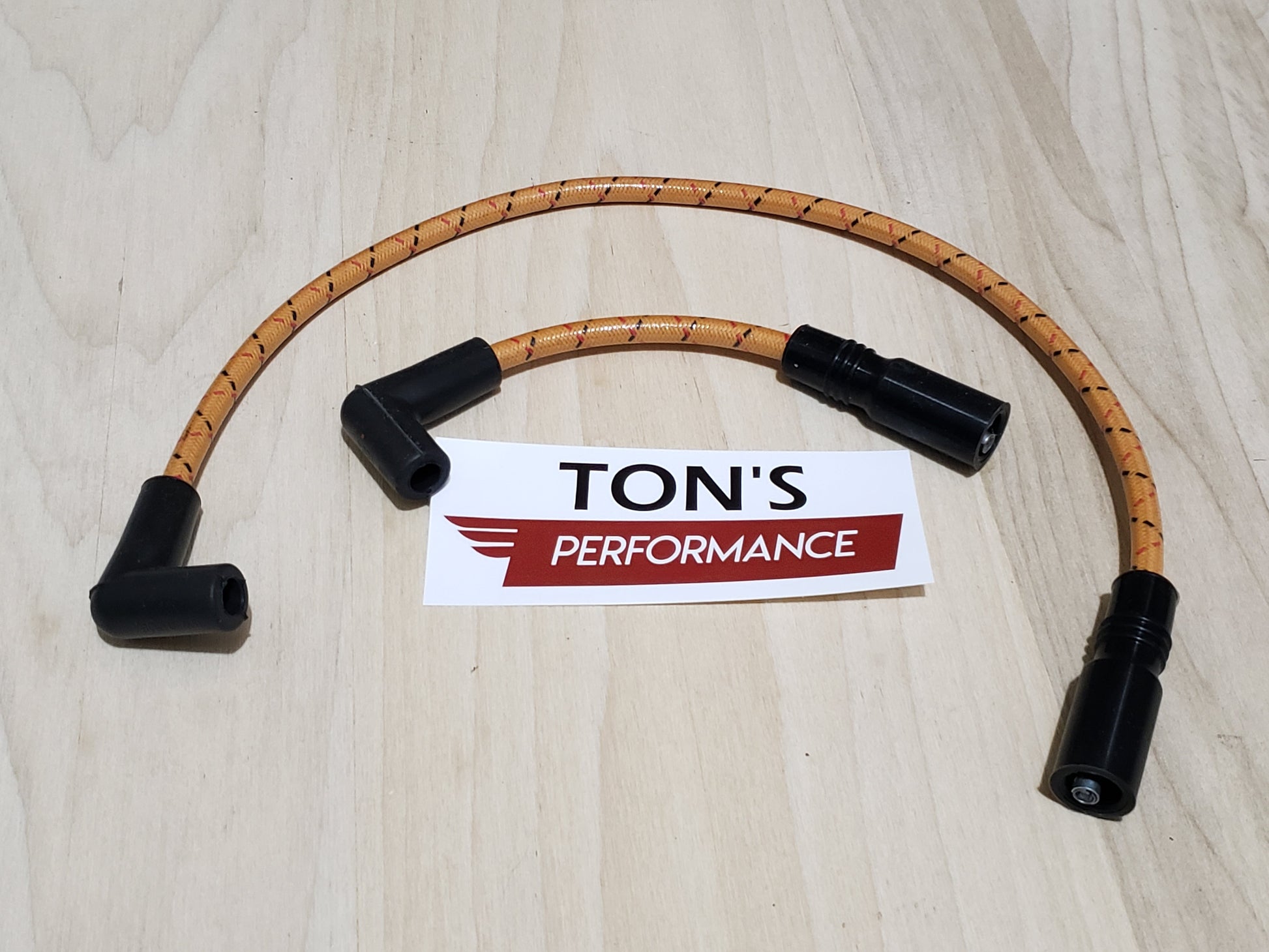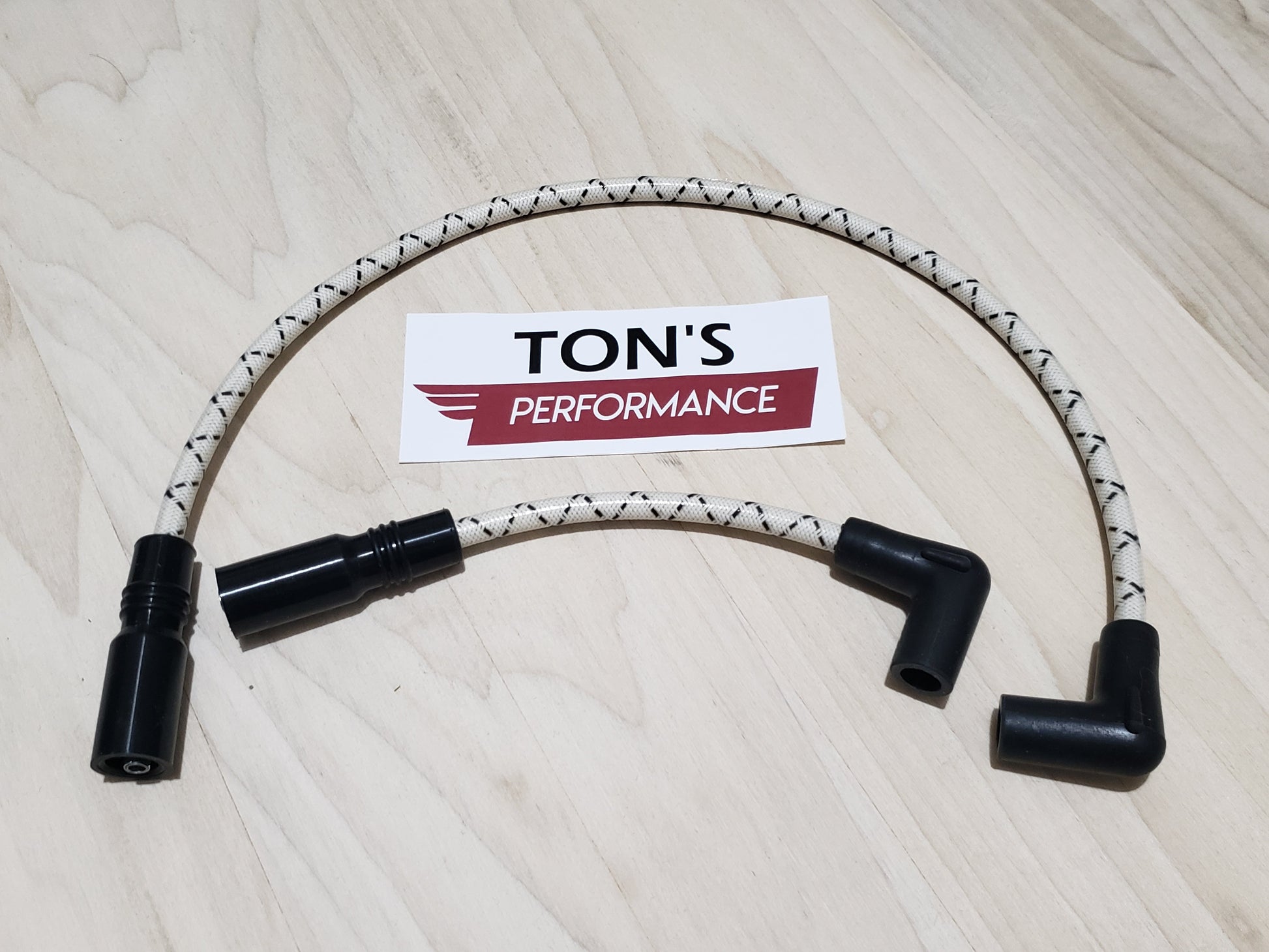 Consists of two OEM length wires for older Harley Davidson Softail models from year 1999 to 2017. Great for replacement coil wire, custom vintage look, bobbers, scramblers, cafe racer etc with OEM coil location on engine. These wires are 100% made in the USA, and are most unique upgrade for your ride. Available in 10+ cloth braided colors! These are very high quality sets that are assembled and put together by Ton's Performance. Different color options are available as pictured! Custom lengths, angle boots are available upon request. Message us for any details.