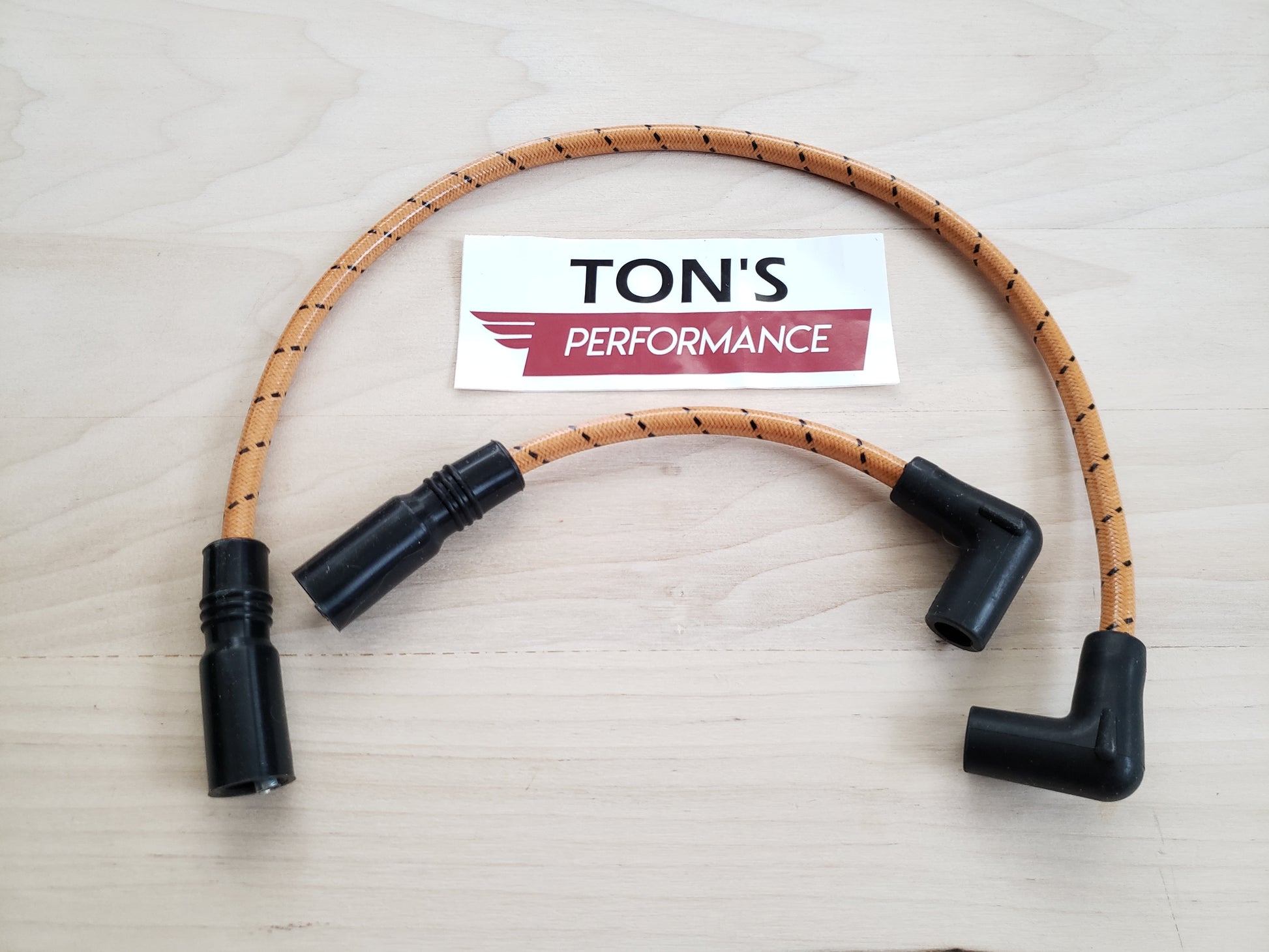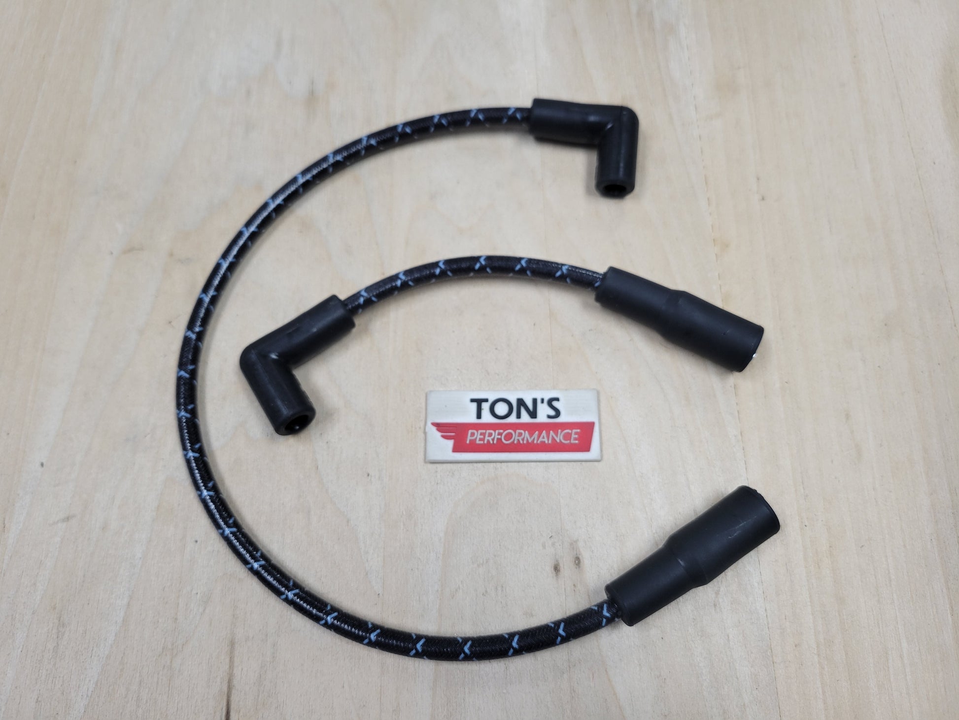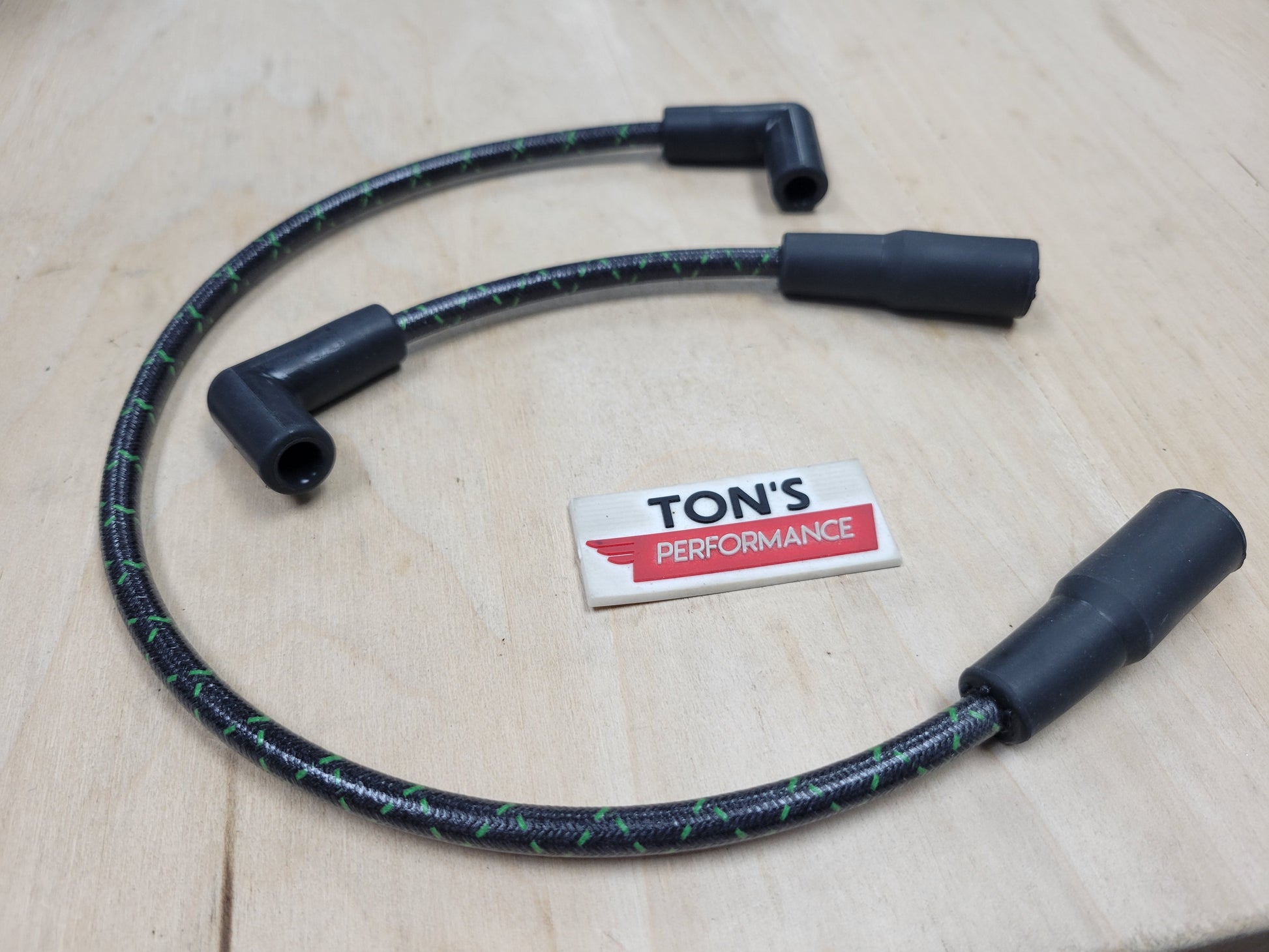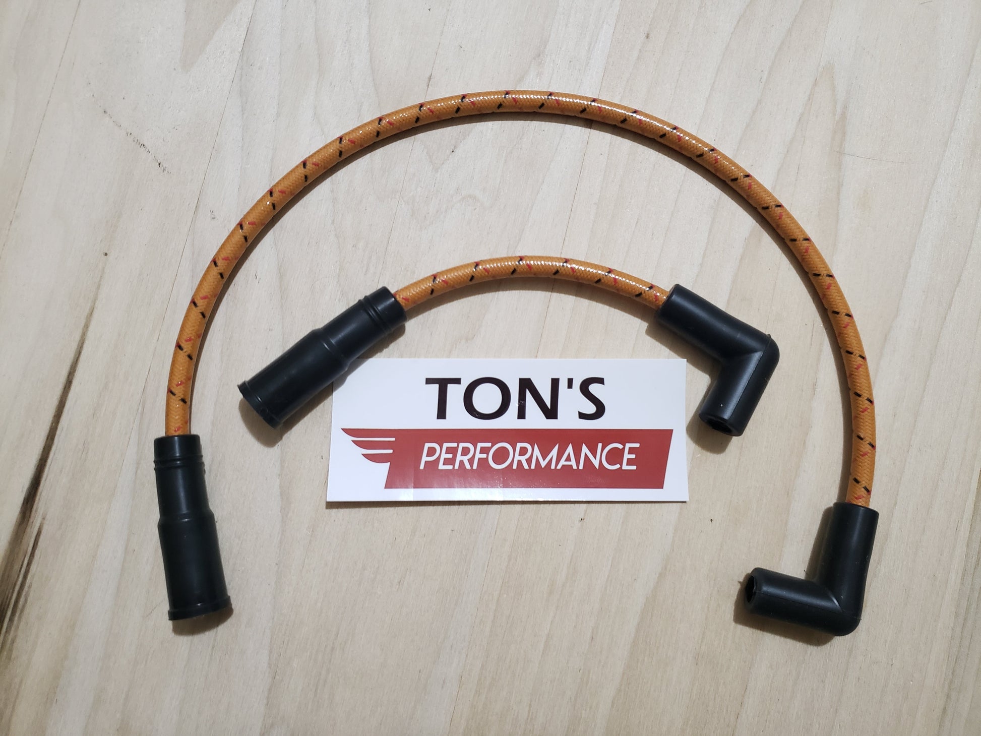 Consists of two OEM length wires for older Harley Davidson Softail models from year 1999 to 2017. Great for replacement coil wire, custom vintage look, bobbers, scramblers, cafe racer etc with OEM coil location on engine. These wires are 100% made in the USA, and are most unique upgrade for your ride. Available in 10+ cloth braided colors! These are very high quality sets that are assembled and put together by Ton's Performance. Different color options are available as pictured! Custom lengths, angle boots are available upon request. Message us for any details.