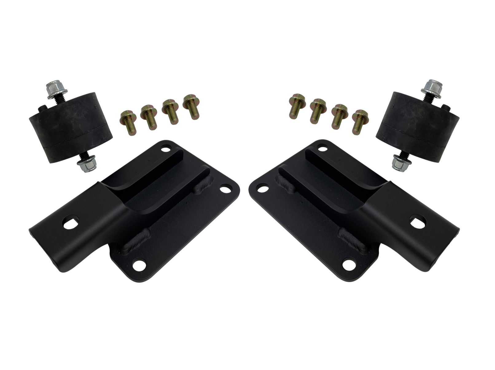 - Requires drilling 7/16" hole in the stock crossmember to fit the anti-rotation pin on the rubber isolators. We recommend using crayon or grease on the end of the pin to mark the drilling location.