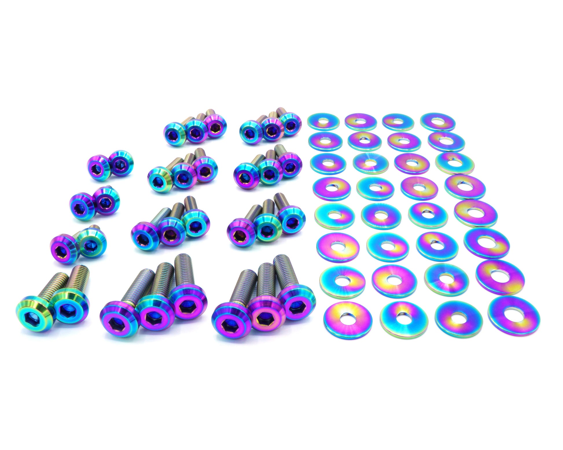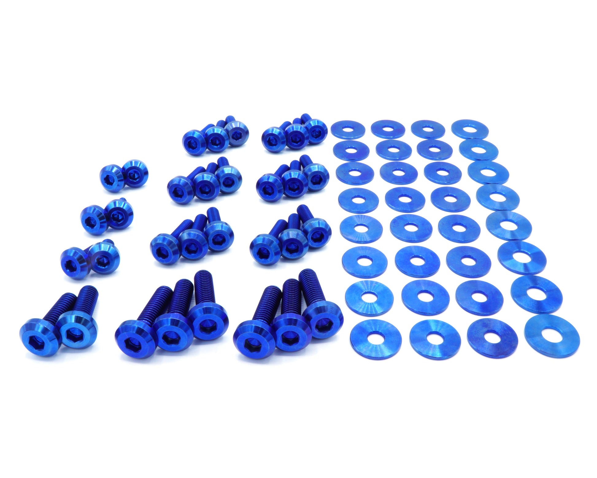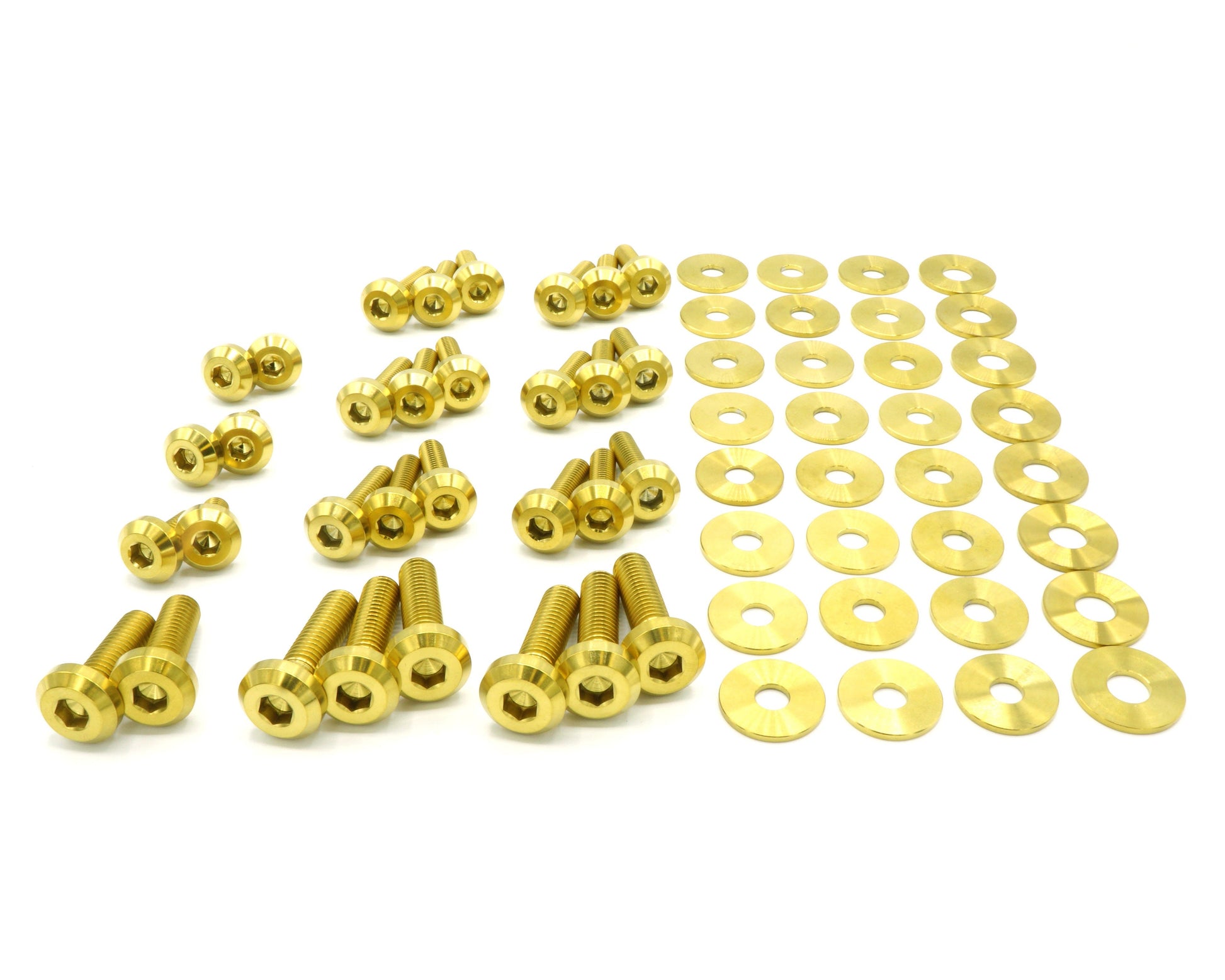 This 64 piece kit includes bolts and washers manufactured from extremely durable, anticorrosive, and lightweight GR5 titanium metal.