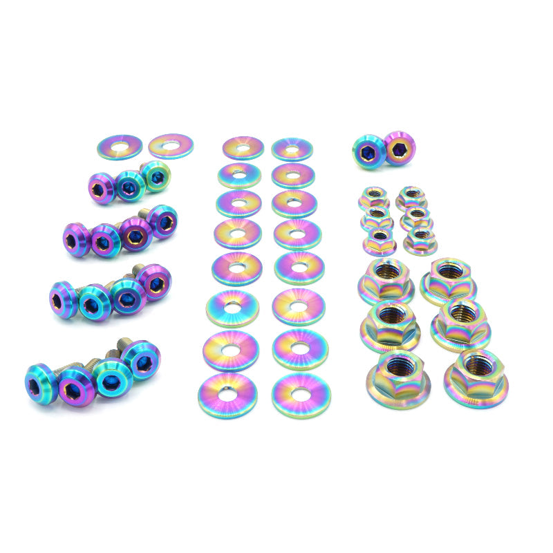 This 47 piece kit includes bolts, nuts, and washers manufactured from extremely durable, anticorrosive, and lightweight GR5 titanium metal.