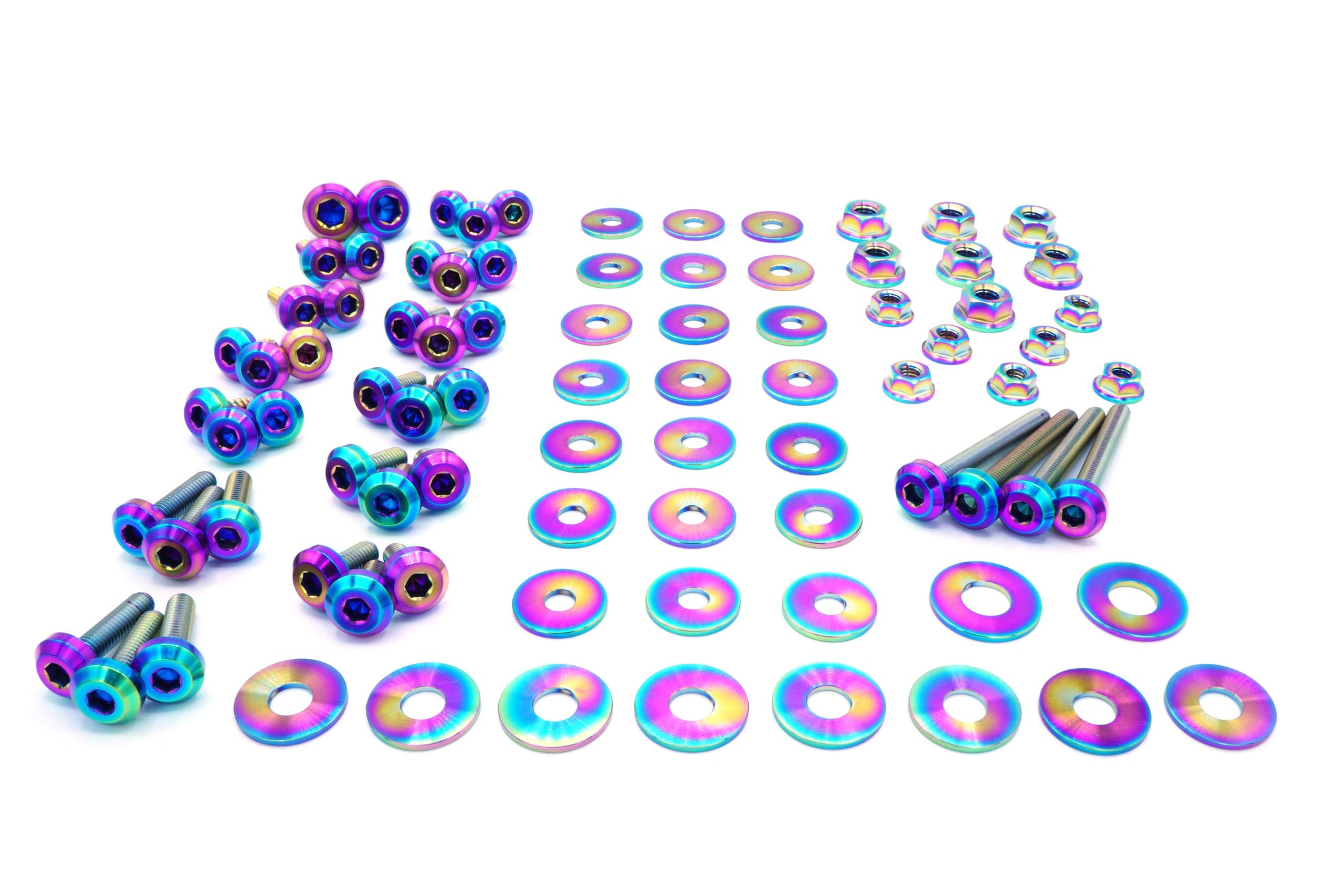 This 85 piece kit includes bolts, screws, nuts, and washers manufactured from extremely durable, anticorrosive, and lightweight GR5 titanium metal.