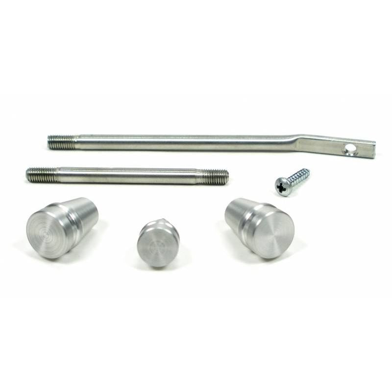 This kit includes a turn signal lever with knob, a tilt lever with knob, and a 4-way flasher knob. The turn signal lever is flattened and attaches to the column with a single screw. The kit fits 1969 and newer GM and Chrysler columns and is available in three different knob styles: Standard, Retro, and Deco (Deco style knobs are only available in polished aluminum finish).