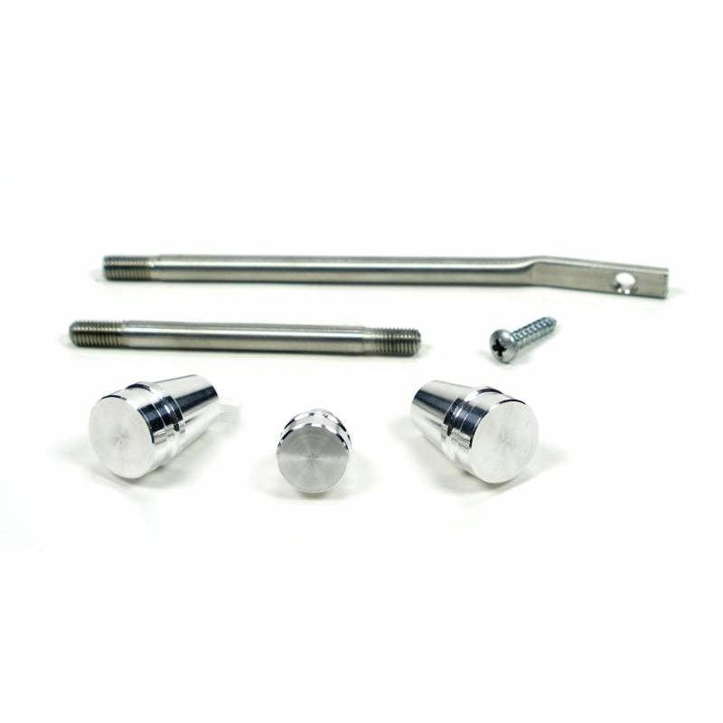 This kit includes a turn signal lever with knob, a tilt lever with knob, and a 4-way flasher knob. The turn signal lever is flattened and attaches to the column with a single screw. The kit fits 1969 and newer GM and Chrysler columns and is available in three different knob styles: Standard, Retro, and Deco (Deco style knobs are only available in polished aluminum finish).