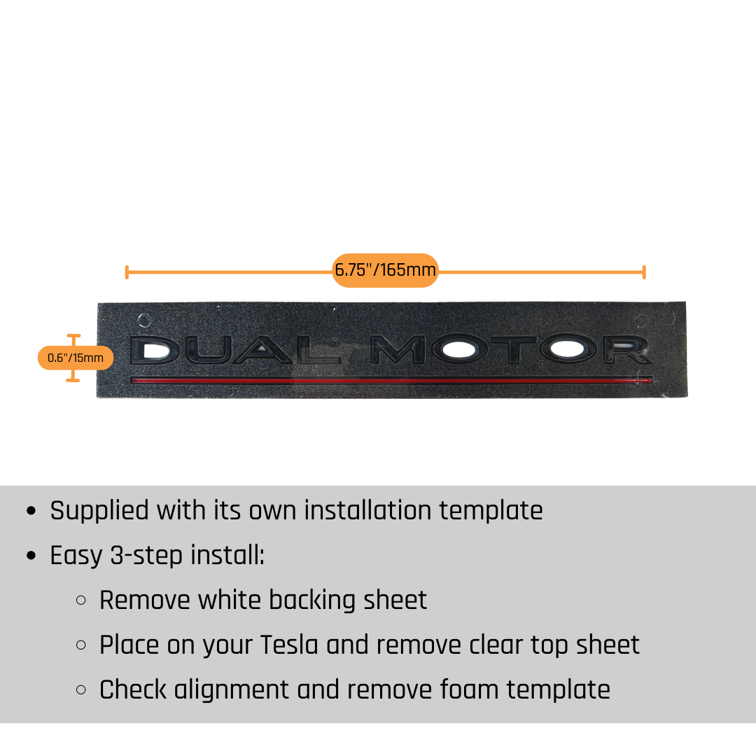 - A tiny bit larger than the Tesla (OEM) chrome Dual Motor emblem, at 6.75" x 0.6" (165 x 15mm)