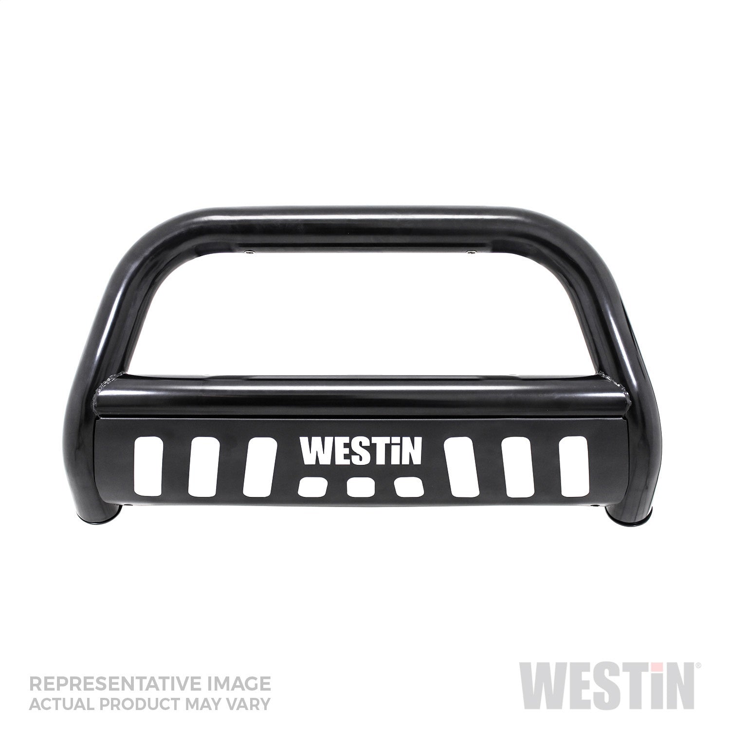 Westins E-Series Bull Bar is a front-end light bar designed for trucks and larger model SUVs. It mounts to the vehicles existing mounting points with no drilling required and comes complete with vehicle specific mount kit. It also features mounting points for 2 auxiliary lights up to 6 inches in diameter. The E-Series Bull Bar features a laser cut Westin block letter logo design on the skid plate. Available in black powder coated e-coated steel with a textured black skid plate backed by a 3 year warranty. Optional license plate bracket is available.