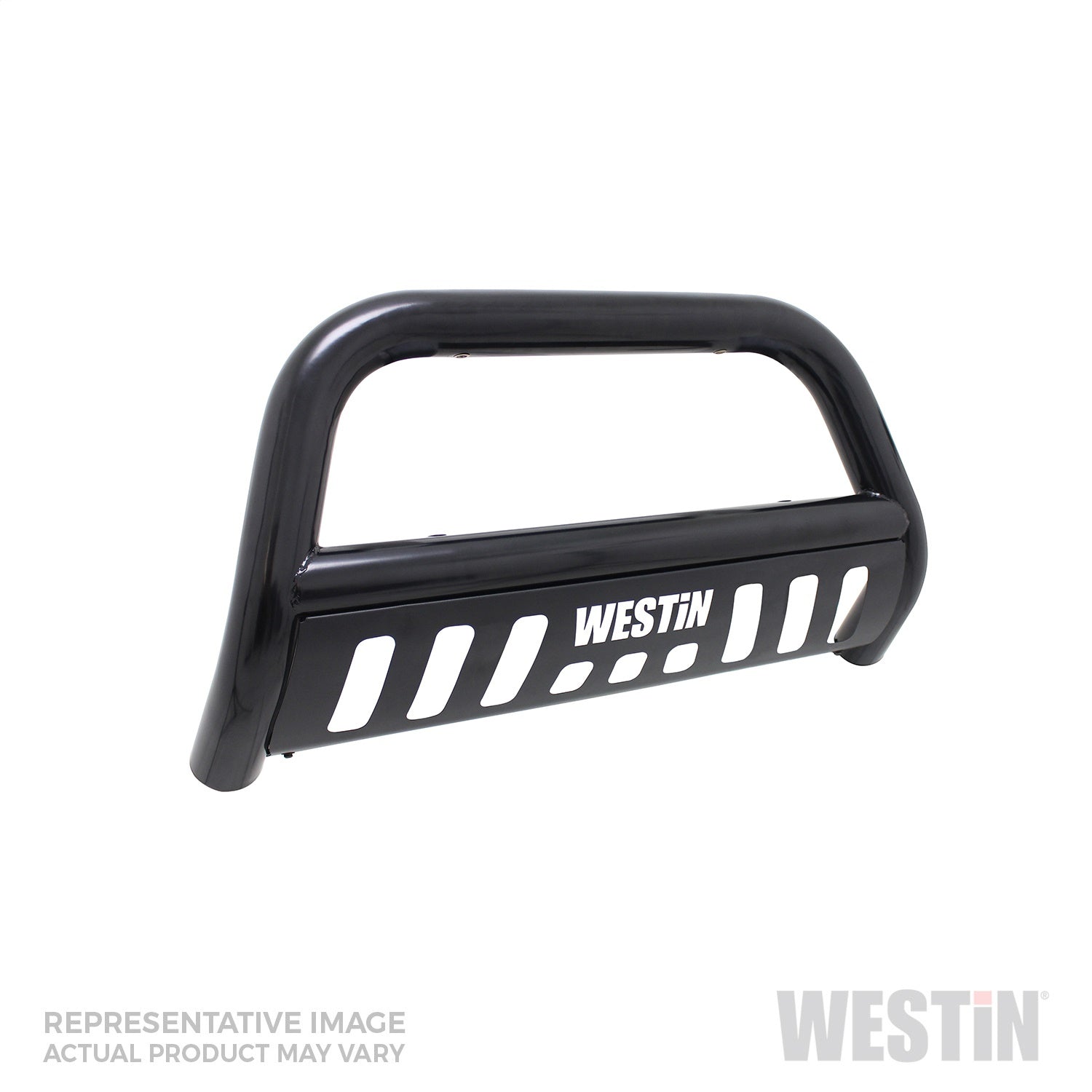 Westins E-Series Bull Bar is a front-end light bar designed for trucks and larger model SUVs. It mounts to the vehicles existing mounting points with no drilling required and comes complete with vehicle specific mount kit. It also features mounting points for 2 auxiliary lights up to 6 inches in diameter. The E-Series Bull Bar features a laser cut Westin block letter logo design on the skid plate. Available in black powder coated e-coated steel with a textured black skid plate backed by a 3 year warranty. Optional license plate bracket is available.