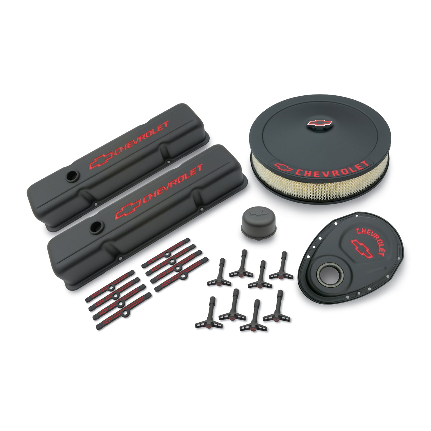 Proform Engine Dress-Up Kit; Black Crinkle Finish; Red Bowtie; Red Letters; For SB Chevy 141-758