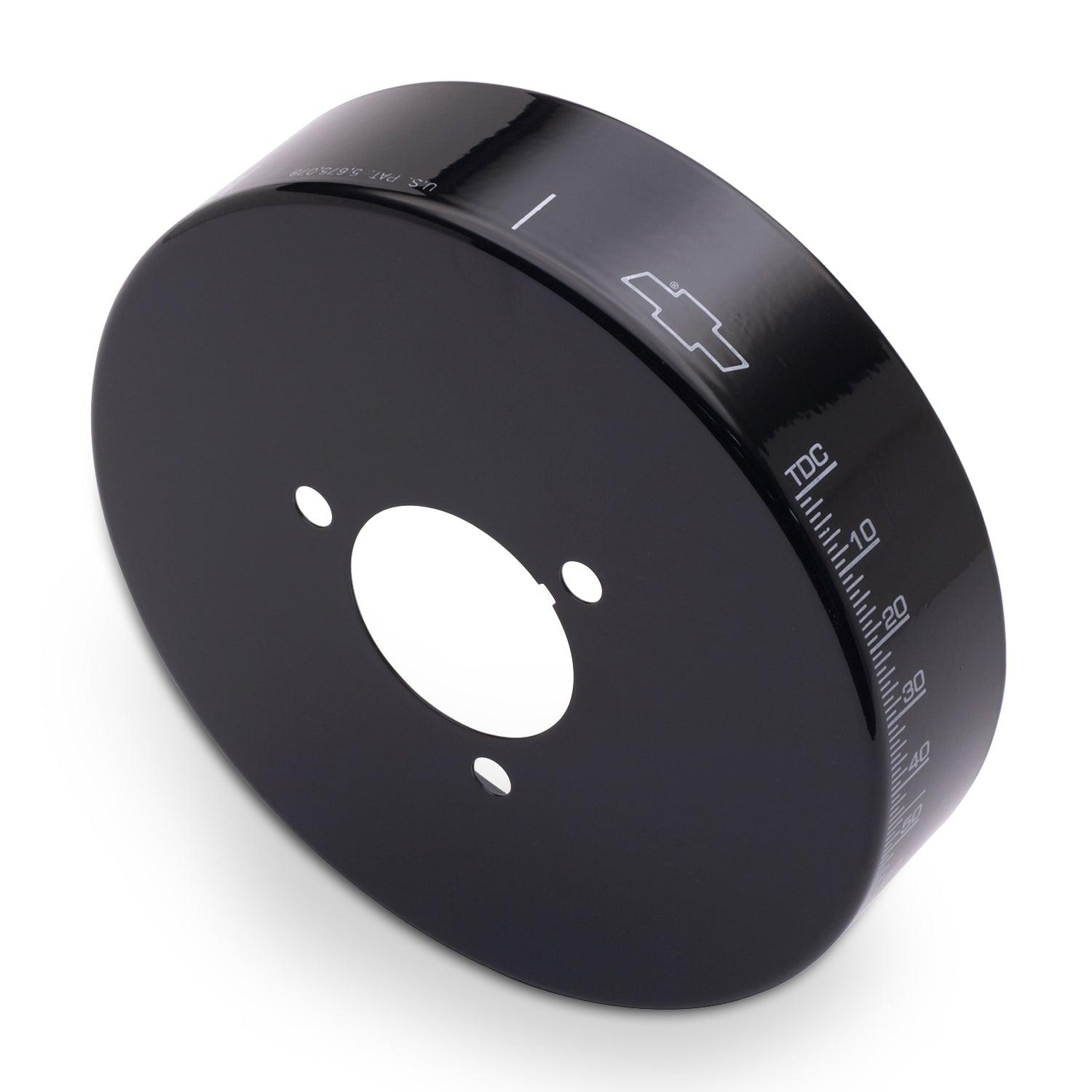 These patented harmonic balancer covers offer improved readability, more stable Top Dead Center indication and timing accuracy, enhanced appearance for a previously ignored underhood area, and the elimination of timing tapes which are inevitably flung off. They are available in chrome and black, resulting in parts with the appearance of $200 balancers. Each cover is distinctively marked with the famous Bowtie Emblem, Top Dead Center and the proper timing degrees. Using this cover improves timing accuracy because over time the etched outer inertia ring of a typical harmonic balancer may slip in relation to the center hub of the balancer, causing the etched markings to provide an inaccurate indication of Top Dead Center for the #1 piston. Mounted directly through the center hub, this cover eliminates the affect of any outer inertia ring slippage. Aluminum. U.S. Patent 5,675,078.