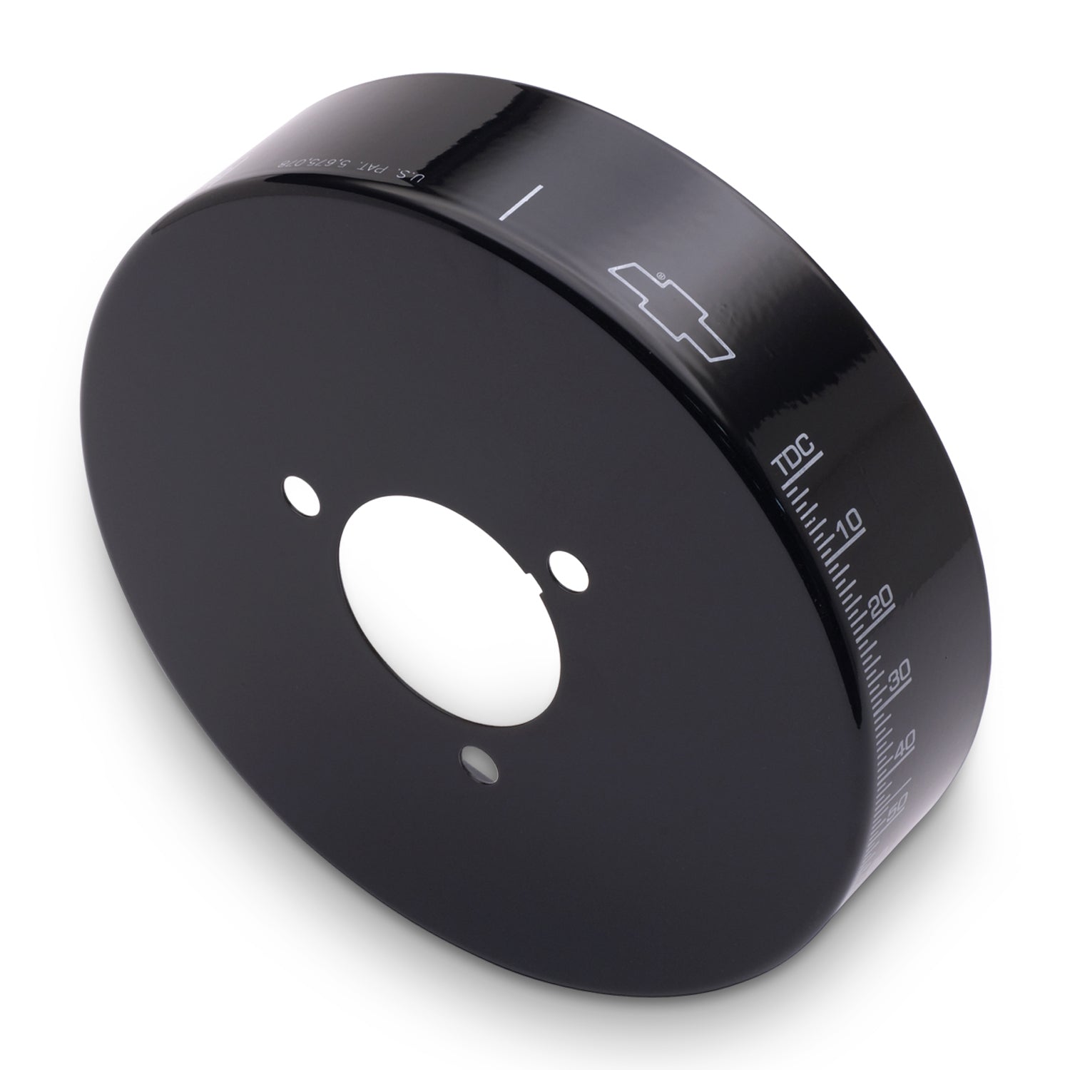 These patented harmonic balancer covers offer improved readability, more stable Top Dead Center indication and timing accuracy, enhanced appearance for a previously ignored underhood area, and the elimination of timing tapes which are inevitably flung off. They are available in chrome and black, resulting in parts with the appearance of $200 balancers. Each cover is distinctively marked with the famous Bowtie Emblem, Top Dead Center and the proper timing degrees. Using this cover improves timing accuracy because over time the etched outer inertia ring of a typical harmonic balancer may slip in relation to the center hub of the balancer, causing the etched markings to provide an inaccurate indication of Top Dead Center for the #1 piston. Mounted directly through the center hub, this cover eliminates the affect of any outer inertia ring slippage. Aluminum. U.S. Patent 5,675,078.