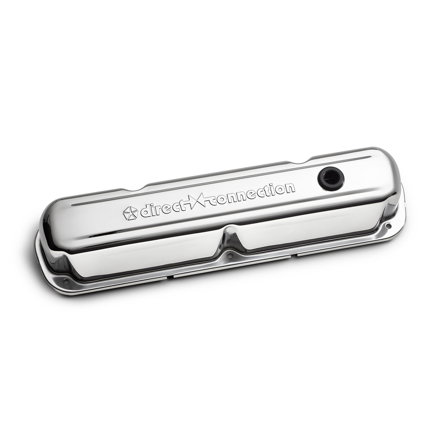 The vintage Direct-><-Connection emblem has been stamped into these valve covers for a nice raised 3D look. Beautiful chrome finish that coordinates nicely with other chrome engine dress-up parts. Oil restricting baffles are pre-installed. All valve covers are sold in pairs, and come equipped with air breather and PCV grommets, unless specified otherwise.