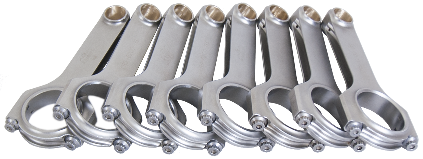 Forged 4340 steel H-Beam connecting rods are forged from a two-piece forging and feature a fully machined and shot-peened surface. Sizing is held to exact tolerances. Sold as a weight-matched set. Recommended for competition use.