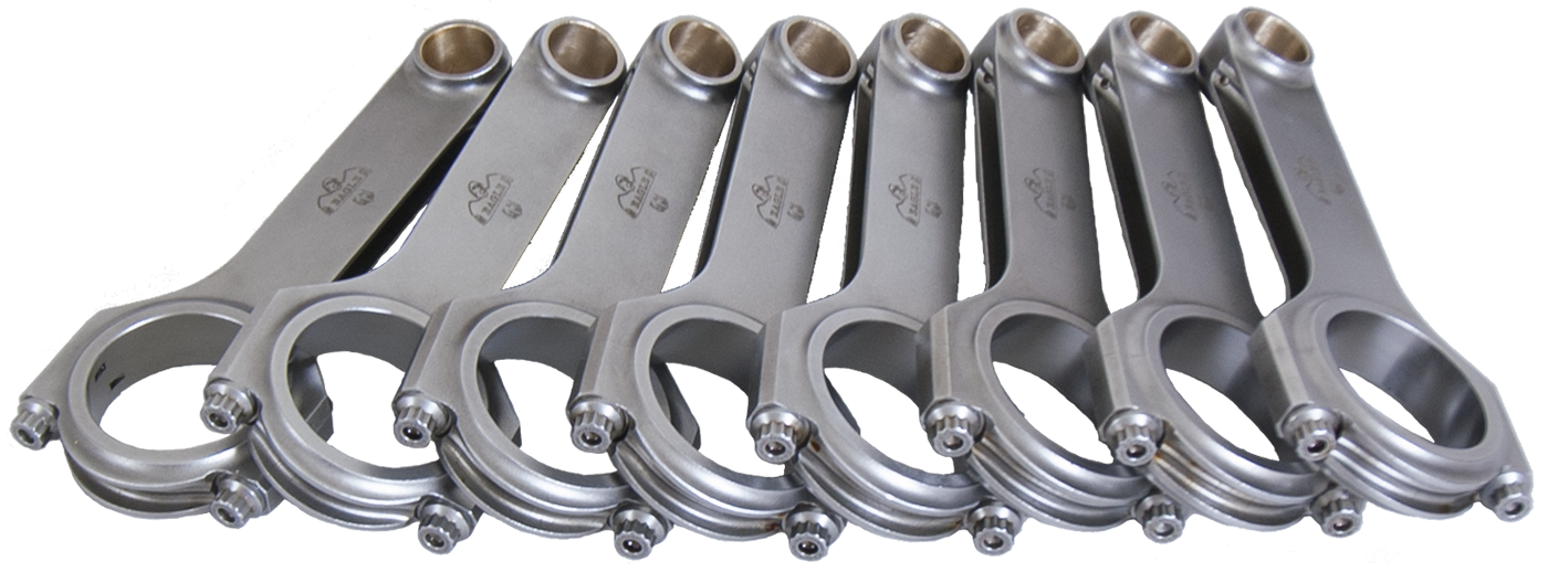 Forged 4340 steel H-Beam connecting rods are forged from a two-piece forging and feature a fully machined and shot-peened surface. Sizing is held to exact tolerances. Sold as a weight-matched set. Recommended for competition use.