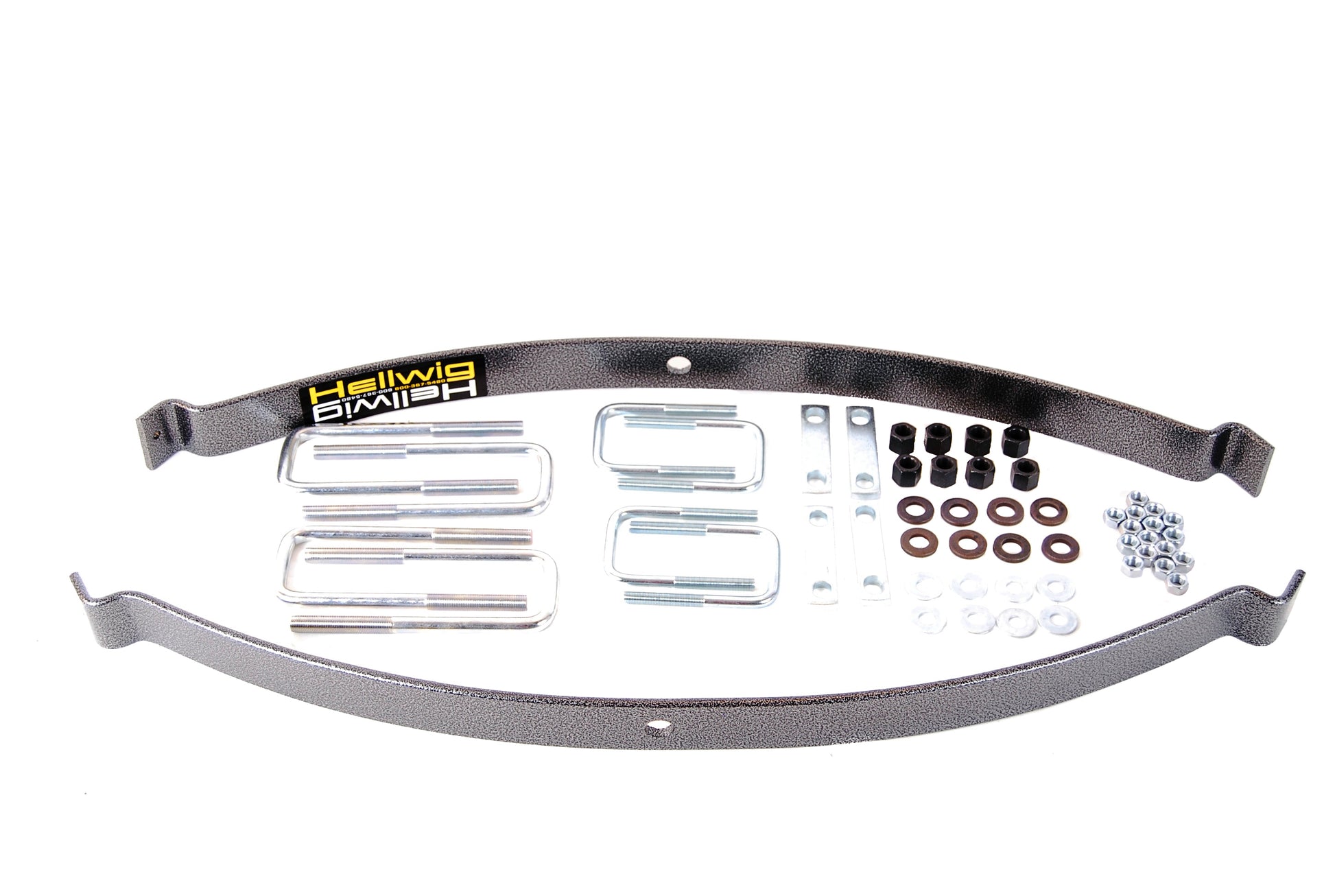 Hellwig's medium-duty EZ-990 Helper Springs pack a lot of capability in every box. Packaged complete with the same heavy duty powder coated and plated components, hardware and installation instructions as our heavy duty helper spring products, these kits are designed for the vehicles that need lighter assistance in carrying a load. Simple bolt on design using common hand tools provide the installer ease of installation and the vehicle owner hassle free use. Ideally suited for light towing and loads, these units are fully adjustable using the heavy duty U-bolts included in the kit using simple hand tools. If your tow and haul needs change, simply adjust the heavy duty U-bolts to suit the new load requirements. Once installed and adjusted you are free to haul or tow with greater control and stability. Manufactured with heat treated ASTM 5160 alloy spring steel in our California based facility, these units are rated up to 2,000 lb. level load carrying capacity. They are a great cost effective spring solution and can be adjusted independently for uneven side to side loads.