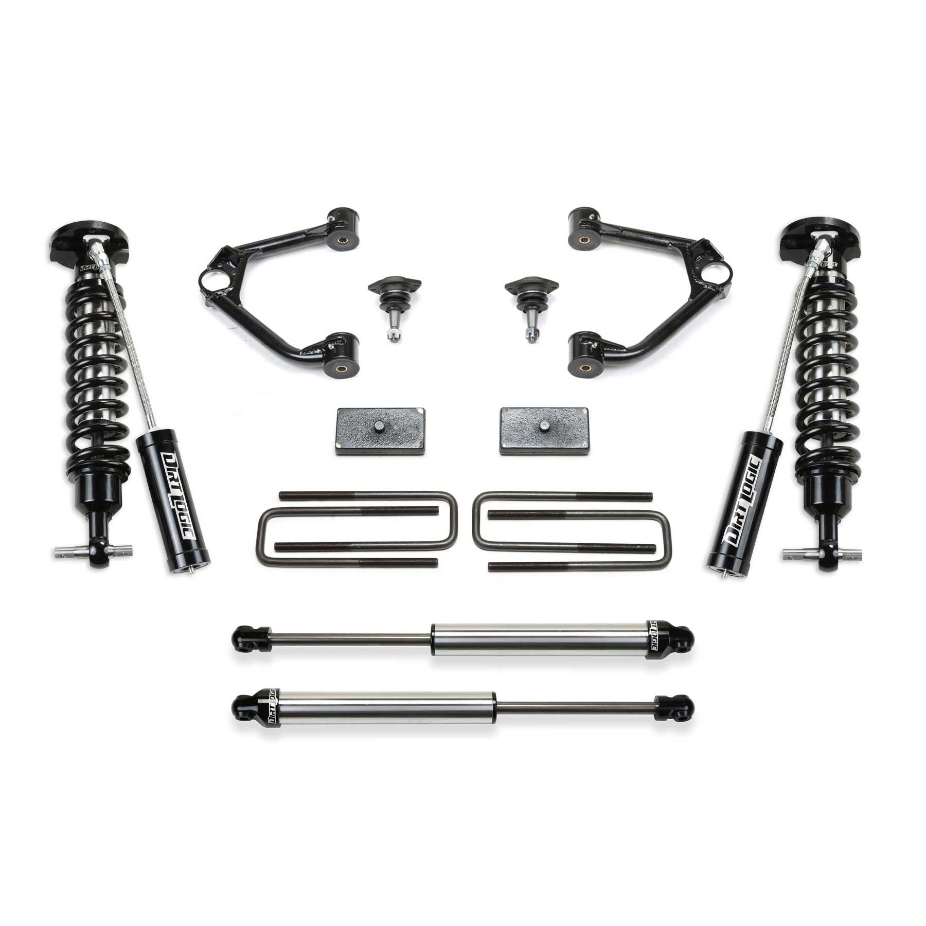 Designed specifically for Trail Boss and AT4 owners that want a little more ride height out of their truck for clearance of full size 33/1250R 18 inch or 20 inch tires, this lift kit is the ticket. Fabtech's Upper Control Arm lift kit provides a 1.5in increased ride height on Trail Boss and AT4 models without creating suspension bind at full droop. These vehicles have a factory 2in lift. With the addition of this 1.5in lift kit, the vehicle will sit as high as a standard model with a 3.5in lift kit and clear a 33in tall tire. This 1.5in lift kit features the legendary stainless steel Dirt Logic 2.5 Coilover shocks. These Coilovers are built of the highest quality materials and will surpass all shocks in corrosion resistance due to the stainless steel body and NitroSteel piston rod. They will provide an outstanding ride quality both on and offroad. The tubular Upper Control Arms with heavy duty ball joints address the geometry of the front suspension with the new ride height for proper alignablity. Due to the new GM suspension geometry of the 2019, there are no differential drop brackets required for the CV axles to operate properly. Rear lift comes from 1in blocks and u bolts. Some owners may opt to not install the rear blocks if they desire to level the stance of the vehicle. The legendary Dirt Logic 2.25 rear shocks are constructed of a stainless steel body with NitroSteel piston rod for maximum corrosion resistance and durability. Superior ride quality both on and offroad. Excellent damping for offroad use. FEATURES: Increased ground clearance, Extended range upper ball joints provide a smooth quiet ride, Increased fender clearance for 33in tall tires, Suspension can be restored to stock, Easy installation.