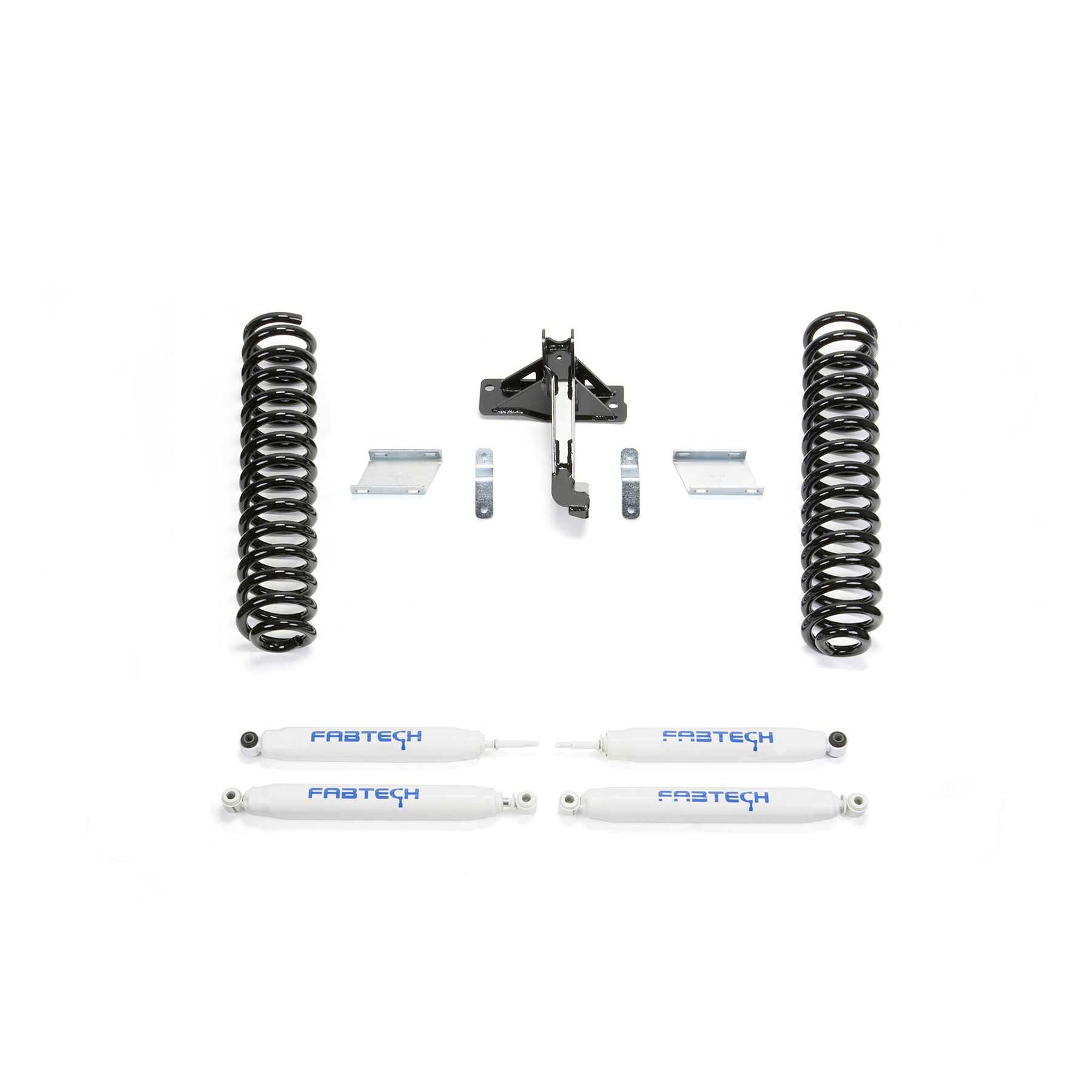 This Super Duty lift kit is perfect for the enthusiast looking to run oversized tires and wants additional Wheel travel for offroad use. With the large Super Duty Wheelwell openings and this quality 2.5in lift kit, you can run 35in tall tires with ease. Fabtech's coil springs retain the factory load carrying capacity while providing increased suspension travel. The coil springs and associated bracketry allow for an additional inch of compression travel over stock without binding the suspension. This extra travel helps when offroading in rugged terrain. Sway bar drop brackets are included to reposition the front bar so that the link ends do not go over center at full droop and cause bind. The brake lines are relocated down on the frame with extension brackets to eliminate the possibility of overstretching the lines throughout the new travel range. Fabtech provides extension brackets rather than longer brake lines to keep the factory brake system sealed for fast and trouble-free installation. This suspension kit utilizes the factory bump stops without extensions. This allows for more travel with the Fabtech coil springs and components. Typically, once a Super Duty is lifted the front axle is pushed to one side due to the length of the track bar and the location. To address this issue Fabtech provides a heavy-duty 1/4in thick steel Track Bar mount. It repositions the track bar and front axle under the vehicle to the factory specifications. This provides proper tracking of the front and rear axle for excellent highway manners. This Super Duty lift kit includes Fabtech Performance shocks. They are a twin tube shock that will provide a good highway ride with the ability to tackle offroad. With the installation of this 2.5in lift the vehicle's stance front to rear will be nearly flat compared to the factory nose-down appearance. For owners that want to retain more of the factory nose-down appearance, Fabtech offers an optional 4in rear block kit (FTS22214). The 4in blocks