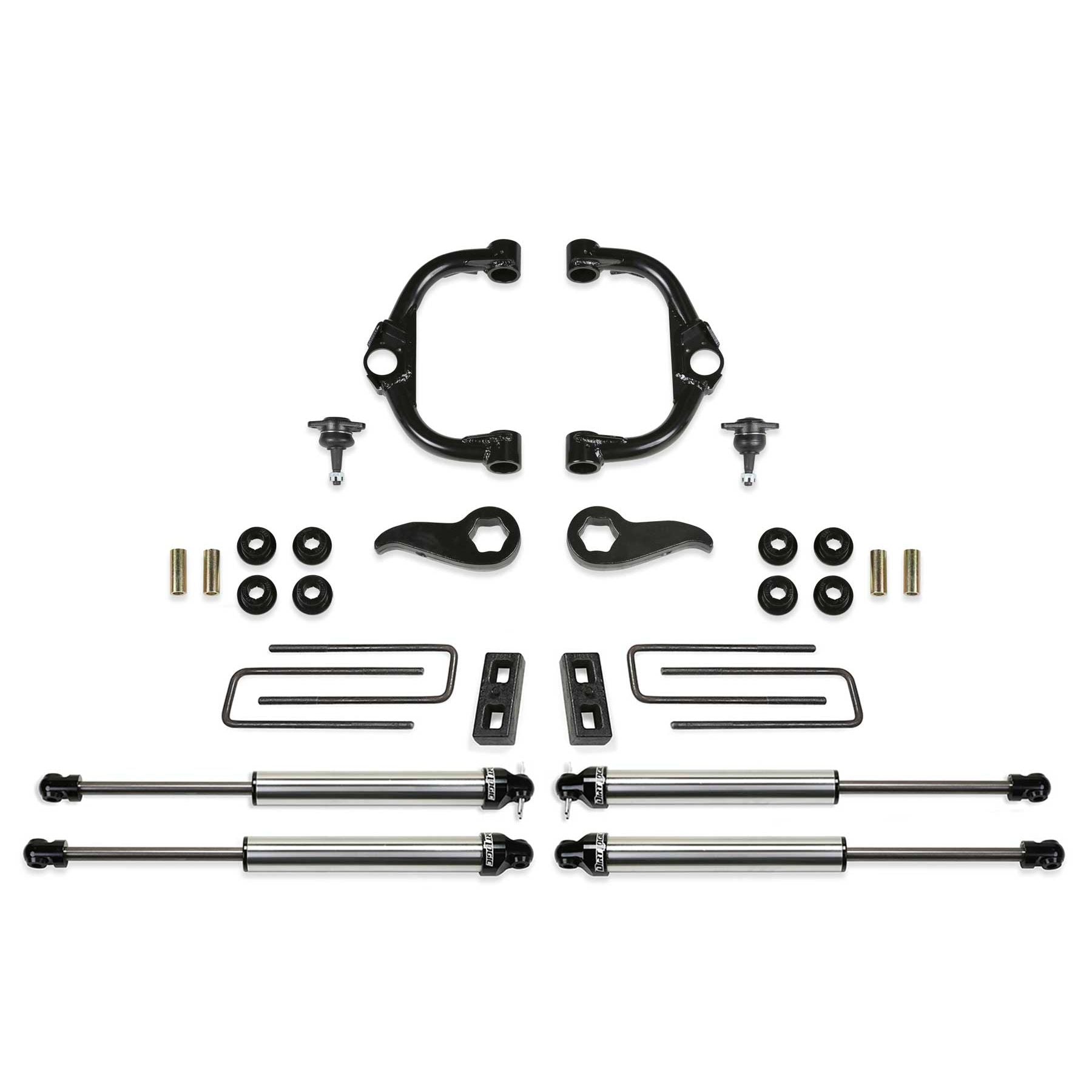 This high quality GM 3500HD lift kit offers an increased ride height for enthusiasts looking to run a 35in tall tire with enhanced offroad capabilities. The stance of the vehicle will become more level front to rear for an aggressive look. The factory GM upper control arms are replaced with Fabtech's heavy duty ball joint tubular arms. They are constructed with 1.50in OD DOM steel tubing and feature a high travel ball joint that is sizably larger than stock. This provides for increased strength both on and offroad. Fabtech sets the ball joint angle to allow for full travel without bind throughout the travel range. Fabtech's forged torsion bar keys replace the factory units and allow for additional ride height adjustment to work in conjunction with the new upper control arms. The rear receives 2in blocks and U-bolts to help level the stance of the vehicle. Fabtech offers their top of the line Dirt Logic 2.25 shocks with this 3500HD lift kit. They are constructed with a stainless steel body and a NitroSteel piston rod for maximum corrosion resistance and durability. These high quality Dirt Logic shocks will provide a superior ride quality both on and offroad with excellent damping for offroad use. This 3.5in HD lift kit comes with high quality components that add strength and reliability to the vehicle while giving it a commanding presence. Tubular Steel Upper Control Arms. Additional 1 degree of caster built in. 1.5in OD x .120in wall DOM tubing. High travel oversized ball joint. 2.25in OD x .250in wall DOM bushing barrels. Heavy duty forged torsion bar keys.