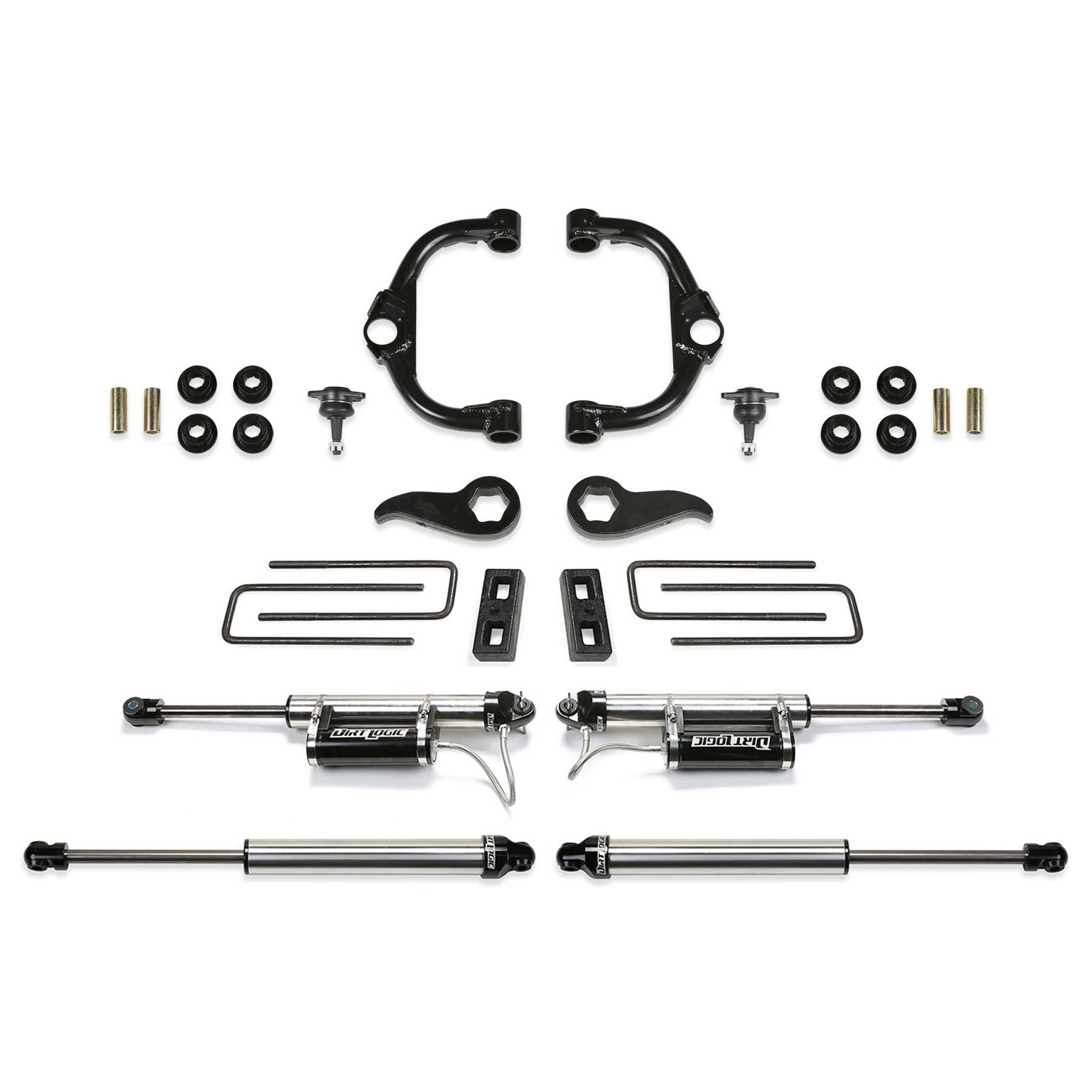 This high quality GM 3500HD lift kit offers an increased ride height for enthusiasts looking to run a 35in tall tire with enhanced offroad capabilities. The stance of the vehicle will become more level front to rear for an aggressive look. The factory GM upper control arms are replaced with Fabtech's heavy duty ball joint tubular arms. They are constructed with 1.50in OD DOM steel tubing and feature a high travel ball joint that is sizably larger than stock. This provides for increased strength both on and offroad. Fabtech sets the ball joint angle to allow for full travel without bind throughout the travel range. Fabtech's forged torsion bar keys replace the factory units and allow for additional ride height adjustment to work in conjunction with the new upper control arms. The rear receives 2in blocks and U-bolts to help level the stance of the vehicle. Fabtech offers their top of the line Dirt Logic 2.25 shocks with this quality 3500HD lift kit. They are constructed with a stainless steel body and a NitroSteel piston rod for maximum corrosion resistance and durability. The front shocks comes with remote aluminum reservoirs to help cool the shock oil for more consistent damping in rugged terrain. These high quality Dirt Logic shocks will provide a superior ride quality both on and offroad with excellent damping for offroad use. This 3.5in HD lift kit comes with high quality components that add strength and reliability to the vehicle while giving it a commanding presence. Tubular Steel Upper Control Arms. Additional 1 degree of caster built in. 1.5in OD x .120in wall DOM tubing. High travel oversized ball joint. 2.25in OD x .250in wall DOM bushing barrels. Heavy duty forged torsion bar keys.