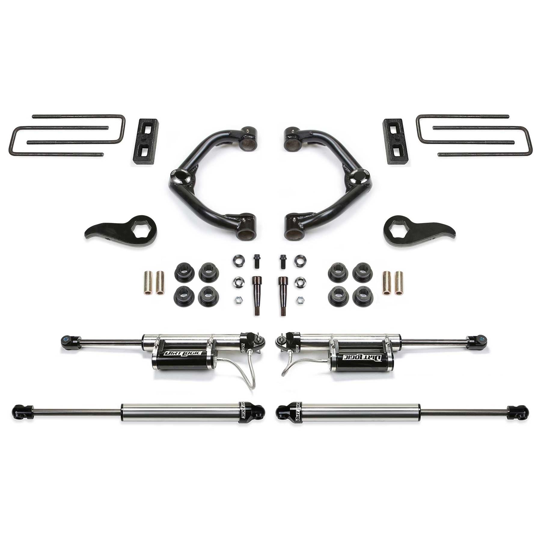 This high quality GM 3500HD lift kit offers an increased ride height for enthusiasts looking to run a 35in tall tire with enhanced offroad capabilities. The stance of the vehicle will become more level front to rear for an aggressive look. The factory GM upper control arms are replaced with Fabtech's Uniball Upper Control Arms that provide additional Wheel travel with an extra degree of caster compared to stock UCA's. They are constructed of the finest material with .120in wall 1.50in OD 4130 Chromoly tubing. High quality 1in FK Stainless PTFE lined Uniball bearings are utilized in place of ball joints. These super stout Control Arms are designed for increased longevity in rugged offroad conditions while providing a more positive on road feel. Fabtech's forged torsion bar keys replace the factory units and allow for additional ride height adjustment to work in conjunction with the new upper control arms. The rear receives 2in blocks and U-bolts to help level the stance of the vehicle. Fabtech offers their top of the line Dirt Logic 2.25 shocks with this quality 3500HD lift kit. They are constructed with a stainless steel body and a NitroSteel piston rod for maximum corrosion resistance and durability. The front shocks comes with remote aluminum reservoirs to help cool the shock oil for more consistent damping in rugged terrain. These high quality Dirt Logic shocks will provide a superior ride quality both on and offroad with excellent damping for offroad use. This 3.5in HD lift kit comes with high quality components that add strength and reliability to the vehicle while giving it a commanding presence. Fabtech UCA's eliminate factory upper ball joint with super strong 1in ID Stainless Steel American Uniball for increased suspension strength. Additional caster is built into Arms for enhanced align ability with oversized tires. 1.50in OD .120in wall 4130 Chromoly tubing reduces flex found in stock arms for more positive road feel. 17-4 Heat treated Uniball pin fits in