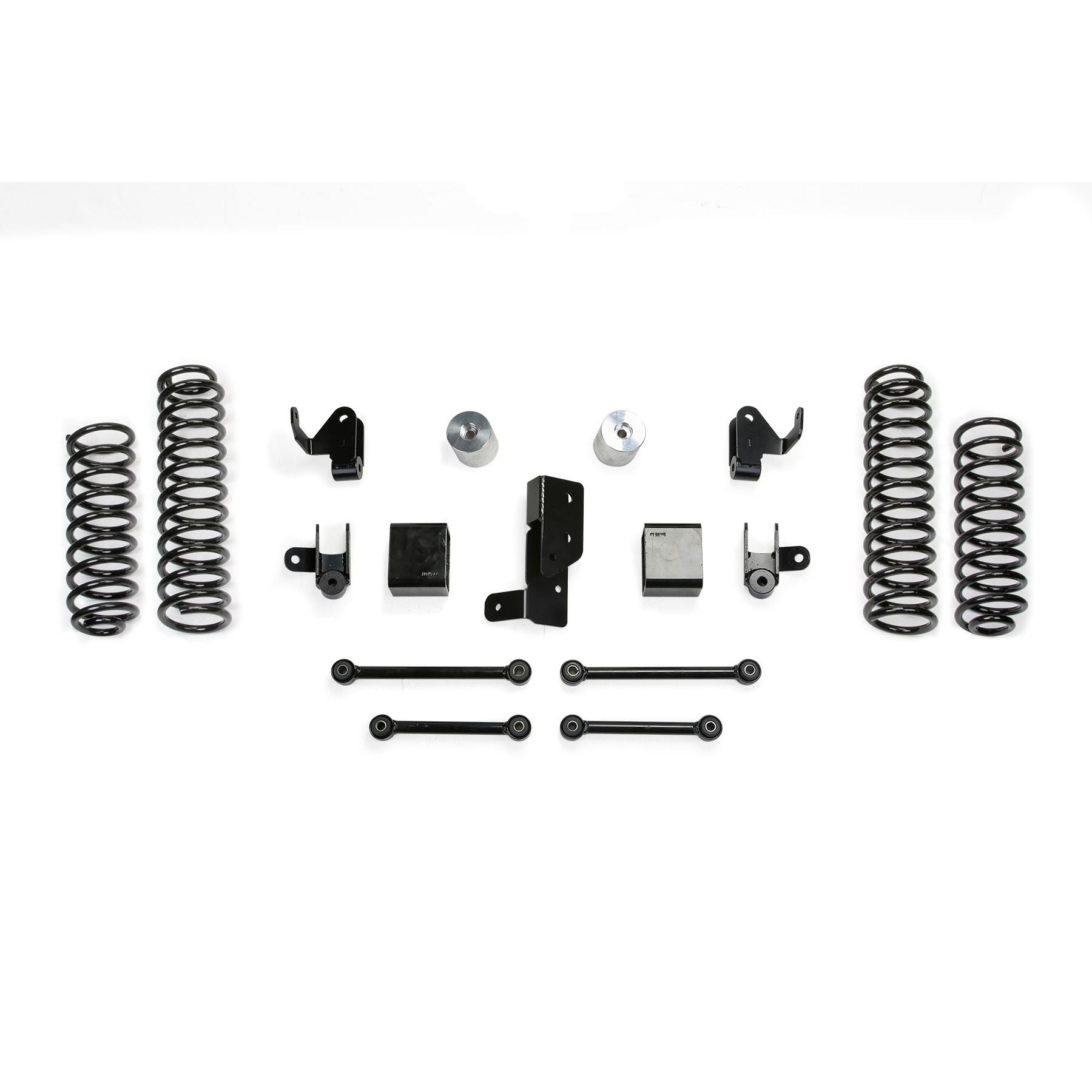 The Sport system features American made coil springs that are a Dual Rate design allowing for long travel suspension use offroad with a smooth highway ride. The first stage of the spring provides a soft ride with the ability to extend for additional travel. The second stage is designed to handle the payload of the vehicle and address large impact absorption at higher speeds. The Dual Rate coil springs are corner specific to the JL. This keeps the vehicle level side to side while allowing for increased suspension travel. Four bump stops extensions utilize the factory bump stops for compliant cushioning at full compression. The extensions retain the stock down travel to eliminate over cycling of the suspension and driveline. The extended length front and rear sway bar links with urethane bushings re-position the bars to work within the factory operating planes. By extending the length of the links, it prevents the sway bar from going over center and creating bind at full extension travel. A heavy duty rear track bar bracket re-centers the axle while retaining the factory roll center of the vehicle with the increased ride height.