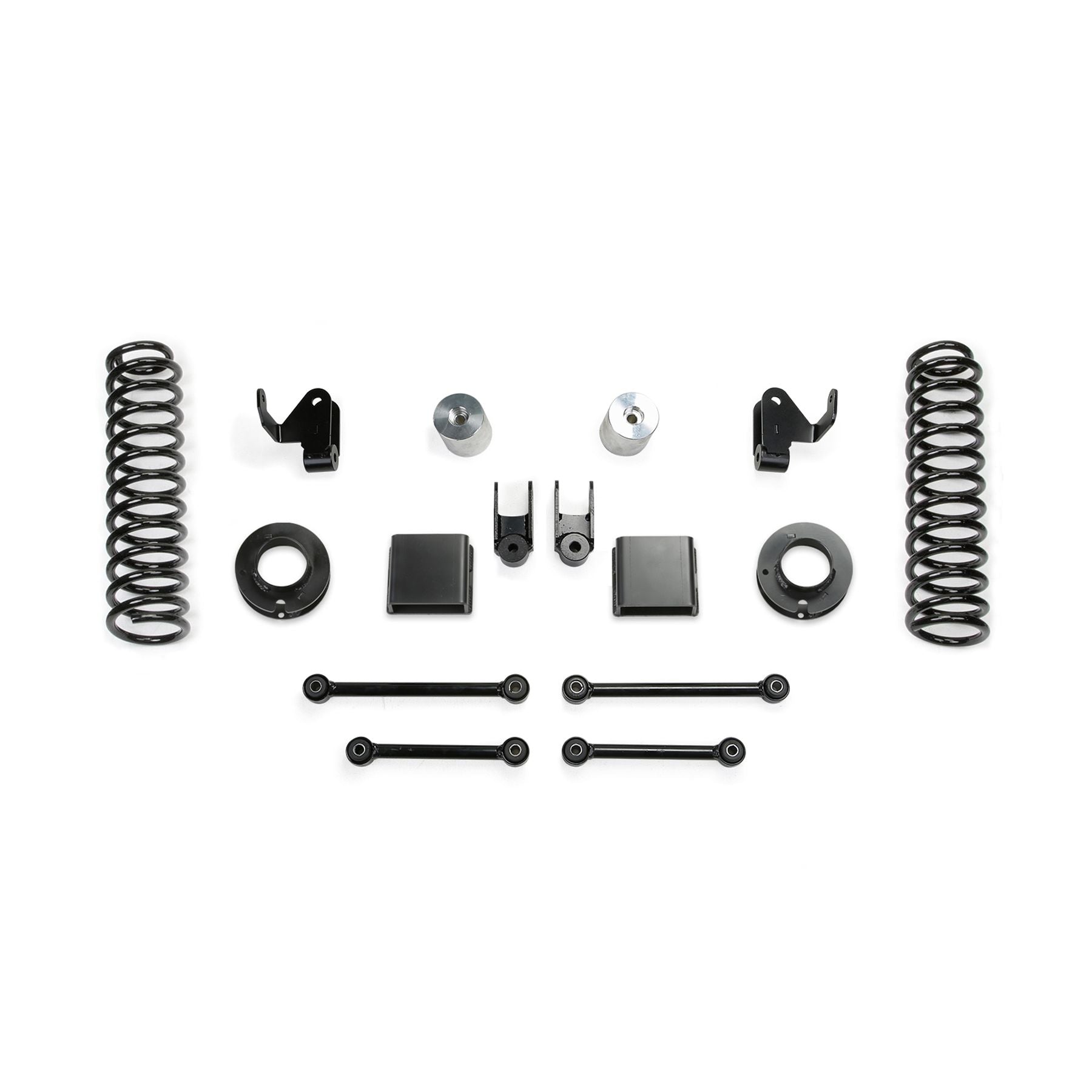 This Sport lift kit is Fabtech's most popular Jeep system providing increased ride height and suspension performance at a great price. Installation is easy and can be installed in a couple hours. The Sport lift kit features American made front coil springs that are a dual rate design allowing extended suspension travel for offroad use while providing a smooth highway ride. The first stage of the spring provides a soft ride with the ability to extend for additional travel. The second stage is designed to handle the payload of the vehicle and address large impact absorption at higher speeds. The rear of the vehicle receives coil spring spacers retaining the factory ride and load carrying capacity. The spacer height is 1-3/4in to help level the stance of the vehicle. Four bump stops extensions utilize the factory bump stops for compliant cushioning at full compression. The extensions retain the stock down travel to eliminate over cycling of the suspension and driveline. The extended length front and rear sway bar links with urethane bushings reposition the bars to work within the factory operating planes. By extending the length of the links, it prevents the sway bar from going over center and creating bind at full extension travel. The factory shocks are retained with steel extension brackets keeping the shocks in the proper travel range with the new ride height. This Gladiator lift kit is an excellent choice for the Jeep enthusiast that wants to run larger tires with enhanced offroad capability and a good highway ride. WHAT'S IN THE SYSTEM: Front Dual Rate Coil Springs, Rear Coil Spacers, Front & Rear Sway Bar Links, Front & Rear Bump Stop Brackets, Free 5 Year 60,000 Mile Powertrain Warranty.