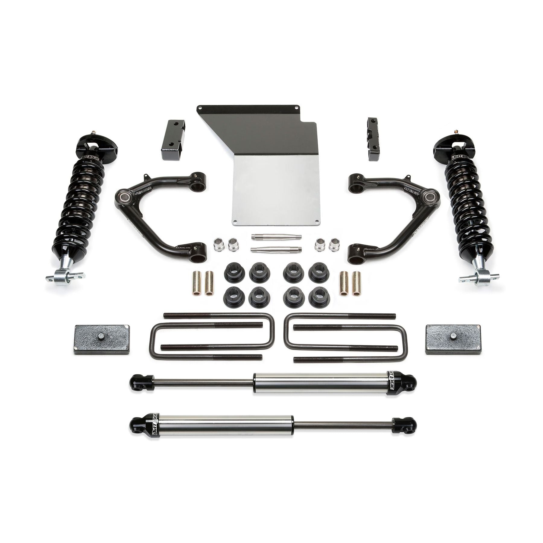 This system offers a mild lift height with easy installation for clearance of 33in tall tires on K1500s. Lift is accomplished with Dirt Logic 2.5 Coilovers that provide superior damping for aggressive offroad use and a good highway ride. The stock upper control arms are replaced with high quality tubular Uniball arms that allow unrestricted movement throughout the travel range. The arms are constructed of top quality material including .120in wall 4130 Chromoly tubing with a 1.50in OD and 1in FK Stainless PTFE Uniballs. These arms are the best on the market for aggressive offroad driving in harsh conditions. The front differential is relocated to keep CV angles proper with the new lift height while a 1/4in thick steel skid plate provides protection against offroad obstacles. Rear lift is accomplished with 1 1/2in rear lift block and u-bolts to help level the stance of the vehicles. Dirt Logic 2.25 rear shock absorbers replace the stock units for increased damping for both on and offroad use. -Best in class system for aggressive offroad use and good highway ride. -Increased ground clearance. -Top quality Uniball Upper Control Arms for aggressive offroad use. -1in ID American made FK Uniballs with PTFE for ultimate strength. -Includes Dirt Logic 2.5 Coilovers for superior damping. -Increased fender clearance compared to a Leveling Kit for 33in tall tires. -Suspension can be restored to stock.