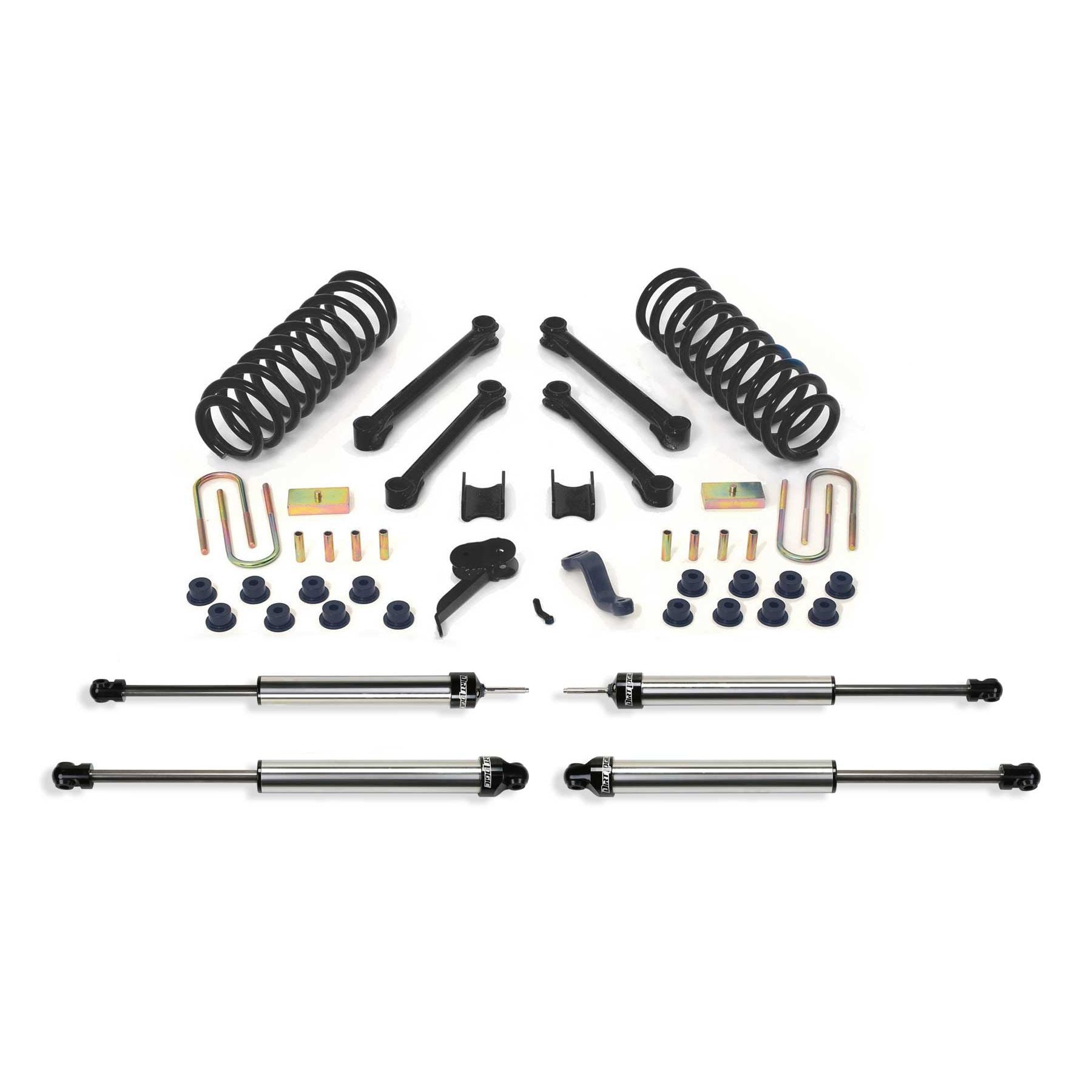 This system includes our replacement front coil springs providing increased ride height and large 1 3/4'' diameter upper and lower control links replace stock units for proper caster and increased strength. Also included is a Pitman Arm, Trac bar bracket, Bump Stops, and a rear block and u-bolt kit. Includes front and rear 2.25 Dirt Logic Stainless Steel shocks.