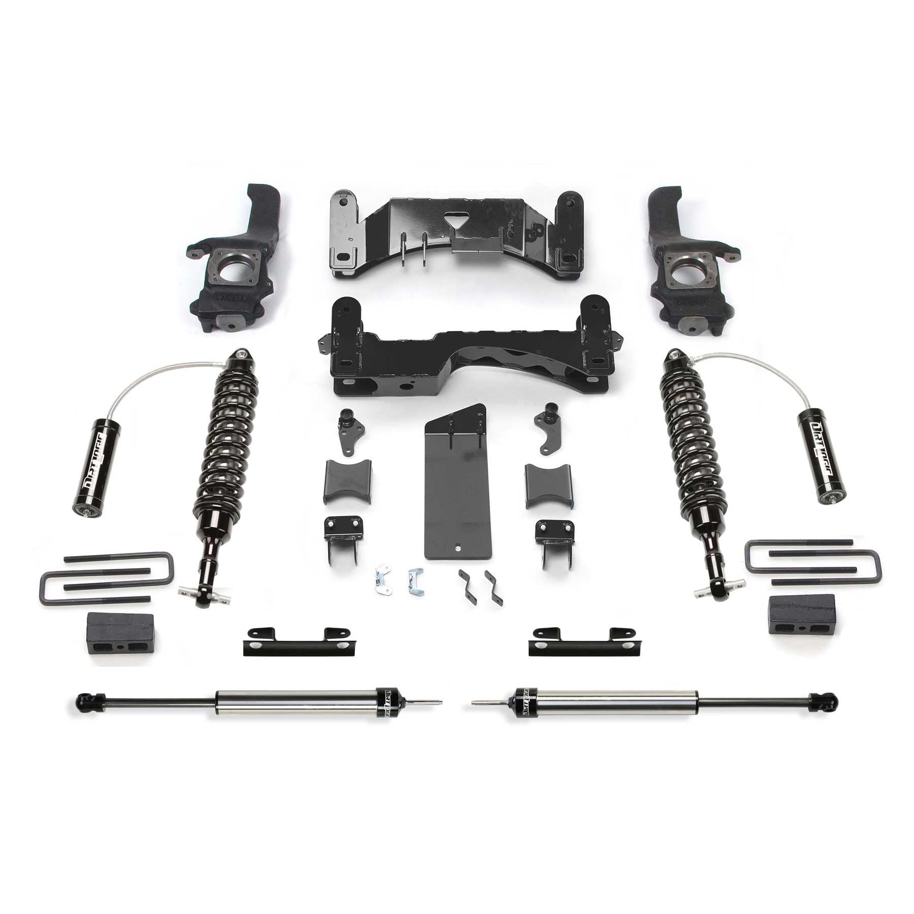 The Toyota Tundra TRD PRO comes with a factory 2in lift compared to other Tundra's of the same years. Fabtech's Tundra lift kit provides a 4in lift height on top of the factory 2in lift for clearance of 35in tall tires. Once a Tundra TRD PRO is lifted with a Fabtech 4in lift kit, the truck will sit at the same height as a standard Tundra with a 6in suspension and 35in tires. The near stock track width keeps the tires under the fenders for a clean appearance. Fabtech's proprietary steering knuckle geometry provides excellent lock to lock turning radius to maneuver in tight spots. Heavy duty 1/4in thick steel crossmembers feature OE style alignment cam pins that utilize the factory cams for easy adjustment. Triple front diff mounts reposition the differential for vibration free operation at high speed. The stainless steel Dirt Logic 2.5 Coilovers replace the TRD PRO Coilovers with an outstanding ride quality both on and offroad. They are designed for aggressive offroad use yet have a supple on road feel. Rear Dirt Logic 2.25 shocks aid in damping the vehicle for a balanced ride. Rear lift is accomplished with a 3in block and u-bolt system. Fabtech has addressed all aspects of the Tundra TRD PRO lift kit for full suspension travel with lock to lock steering without over cycling. Comes with a free 5 year 60,000 mile Powertrain Warranty. FEATURES: CROSSMEMBERS - 1/4in thick steel lower control arm Crossmembers are arched for maximum ground clearance. The welded box design of these Crossmembers provides additional strength to the front suspension. STEERING KNUCKLES - Fabtech's extended length ductile iron Steering Knuckles provide zero bump steer throughout the suspension travel. This provides an enhanced driver experience compared to stock. Near stock track width keeps the tires under the fenders for a clean appearance. TIE RODS - Oversized tie rods are provided to replace the stock units that are designed to handle oversized tires. DIRT LOGIC 2.5 COILOVERS -