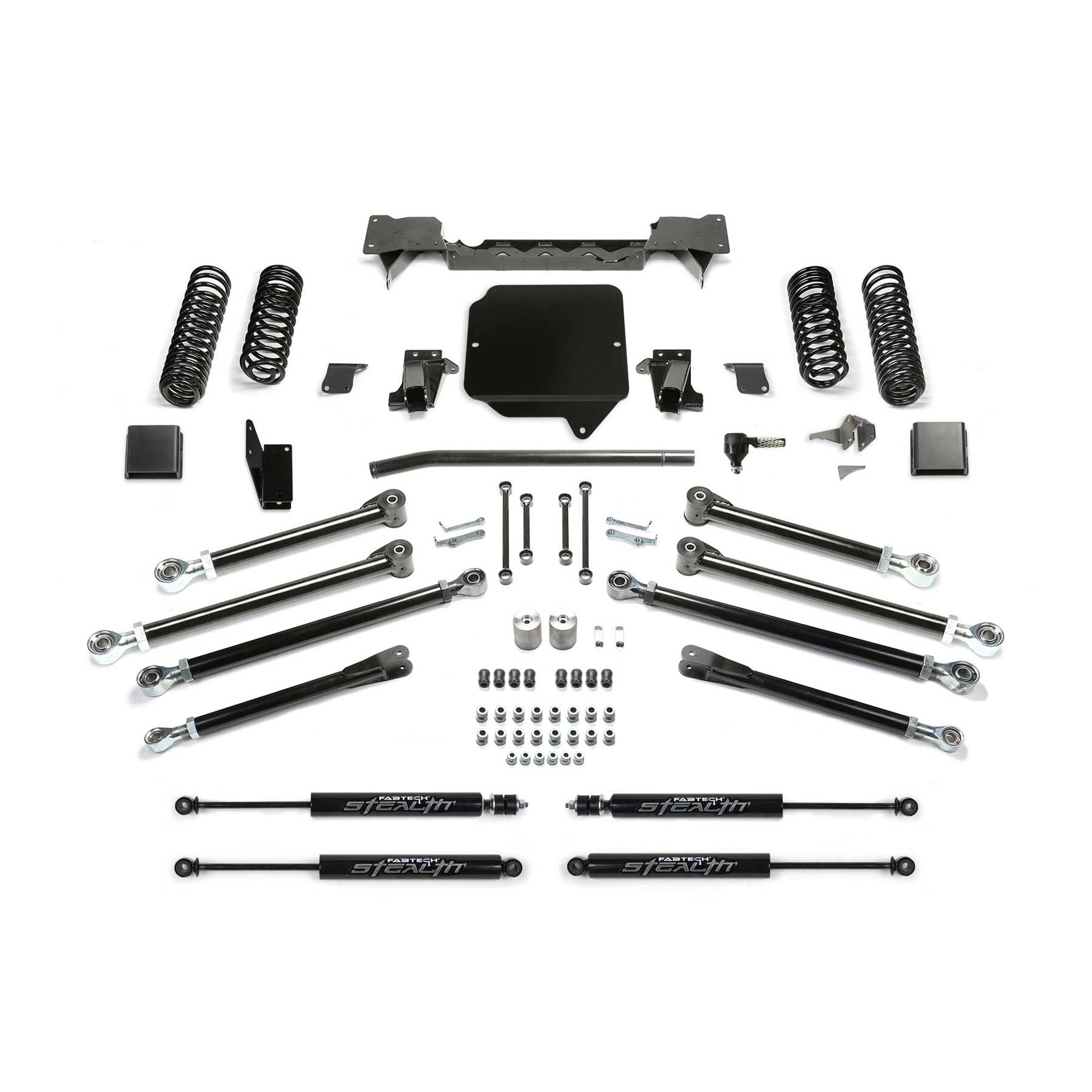 Fabtech's Crawler long arm Gladiator lift kit is built to meet the most experienced driver's expectations without having a questionably fabricated suspension. If you are in the market for a system that will work properly right out of the box and does not require continued fabrication and constant maintenance, look no further. A key part of the Crawler kit is the Link Arm geometry and ground clearance. The location of the of the link arms is critical in providing superior handling throughout the travel range. Fabtech has found the Gladiator's sweet spot geometry for the link arms that provide a superior driving long arm system compared to all others on the market. Front link arms are mounted to a full width crossmember that spans frame rail to frame rail. This crossmember is key in not only in mounting the Links arms at the correct geometry but it adds critical strength to the Gladiator frame for hard offroad use. Adjustable rear links utilize the factory frame and axle brackets for an easy installation. The Fabtech lower Link Arms are massive and built of 2in OD .313 thick wall tubing that is guaranteed not to bend. Upper and lower Link Arms includes the Fabtech's legendary 5 Ton joints that come with lifetime guarantee of never wearing out. They are superior for offroad use with a smooth quiet operation on the street. This high quality Long Arm Gladiator lift kit will provide exceptional offroad performance with good highway manners for the discerning Jeep enthusiast. Each Fabtech component has been designed with specific features and benefits that create this quality suspension system. What's In The System: Front Upper and Lower Link Arms. Rear Upper and Lower Link Arms. Front Link Arm Crossmember. Heavy Duty Flipped Draglink. Front and Rear Track Bar Brackets. Front and Rear Corner Specific Dual Rate Coil Springs. Front and Rear Sway Bar Links. Front Shock Mount Bracket. Front and Rear Bump Stop Extensions. LINK ARMS: Heavy duty is the only way to describe these