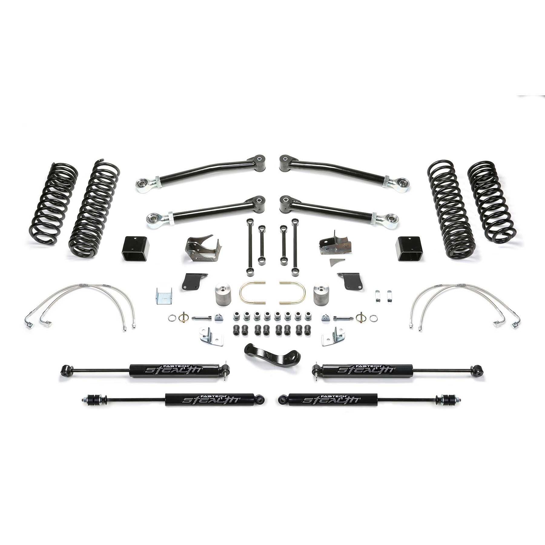 Utilizing the factory link arm mounts Fabtech's Trail short arm suspensions are built for aggressive offroad use while providing a smooth and quite highway ride. Each system has features and benefits that address all variants of off highway travel use including rock crawling, aggressive trail use and overland expeditions. The Trail system replaces the four lower link arms due to their vulnerability to offroad obstacles. Link arms come with large poly urethane bushings on one end with internal threads on the other to accept the ground breaking Fabtech 5 Ton Joint for longevity and a quite ride. System includes dual rate Long Travel coil springs that provide factory load carrying capacity with a smooth ride. The flexible coil design offers an extended travel range for aggressive rock crawling with great highway manners. Includes Lower Short Arm Links Front & Rear, Long Travel Coil Springs Front & Rear, Adjustable Track Bar Front, Sway Bar Links Front, Track Bar Bracket w/ Support Rear, Brake Lines Front & Rear, E Brake Bracket, Front Bump Stop Extensions, Rear Bump Stop Brackets and Stealth shocks.