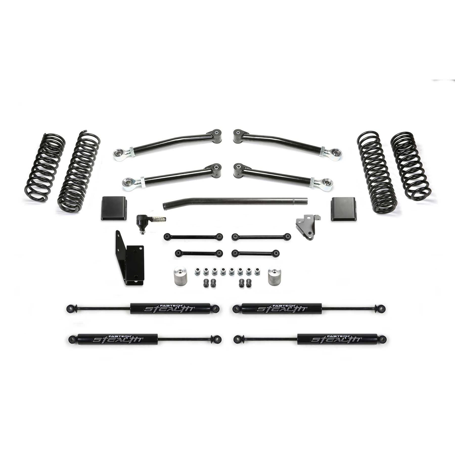 This Trail Lift Kit provides enhanced suspension performance to address all variants of off highway travel use including rock crawling, aggressive trail use and overland expeditions. This Gladiator lift kit has been tuned with proper dual rate coil springs and shock valving to provide a very compliant ride that you will appreciate. The system is a complete short arm suspension that utilizes the factory lower control arm mounts for an easy installation. The Fabtech lower link arms are constructed of thick wall steel tubing that are guaranteed never to bend. They come with large polyurethane bushings on one end with internal threads on the other to accept the groundbreaking Fabtech 5 Ton Joint for longevity and a quiet ride. Fabtech's dual rate Gladiator coil springs are corner specific to the Jeep JT. This keeps the vehicle level side to side and allows for increased suspension travel. The first stage of the spring provides a soft ride with the ability to extend for additional travel. The second stage is designed to handle the payload of the vehicle and address large impact absorption at higher speeds. To address the steering geometry with the increased ride height, a Draglink Flip kit along with a heavy duty Track Bar bracket is included. This relocates the Gladiator steering geometry to the factory plane allowing for full articulation without binding the draglink ends in extreme conditions. The rear Gladiator suspension receives a heavy duty Track Bar bracket to center the axle under the vehicle with the new ride height and help retain the factory roll center of the vehicle. Front and rear bumps stop extensions protect the Jeep Gladiator suspension from over cycling. This popular Jeep Gladiator lift kit is a top choice for daily drivers that enjoy tackling tough trails and overlanding with the comfort that they have a high quality complete suspension under their Gladiator. Each Fabtech component has been designed with specific features and benefits that crea