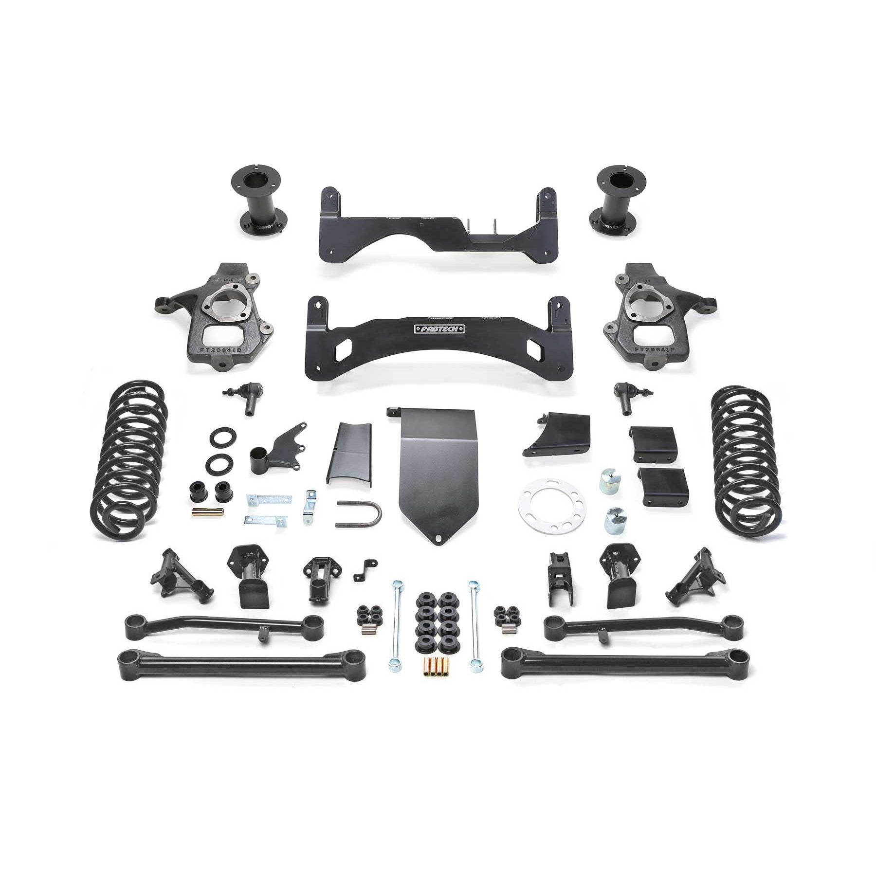 This high quality 6in system retains the factory track width keeping the tires under the fenders for a clean appearance. It has been designed to clear 33in tall tires while providing a factory like ride quality. Heavy duty 1/4in thick steel lower control arm Crossmembers provide superior ground clearance while the integrated front differential Skid Plate adds protection to the drivetrain. The front differential is relocated in a manner to reduce driveline vibration when in 4 Wheel drive mode at highway speeds. The system utilizes a simplistic upper Coilover spacer that does not require the disassembly of the shock for a quick installation. The factory rear shocks are retained with extended length mounts. Fabtech's rear Coil Springs provide increased ride height with a comfortable highway ride. New upper and lower rear Link Arms re-positions the differential to the precise pinion angle to eliminate driveline vibration at all speeds. Rear extended length Sway Bar Links and heavy duty Track Bar Bracket retains the proper roll center of the vehicle for both on and offroad use. This system passes FMVSS 126 standards for stability control functionality as tested by an independent lab. All systems come with a Free 5 year 60,000 mile Powertrain Warranty.