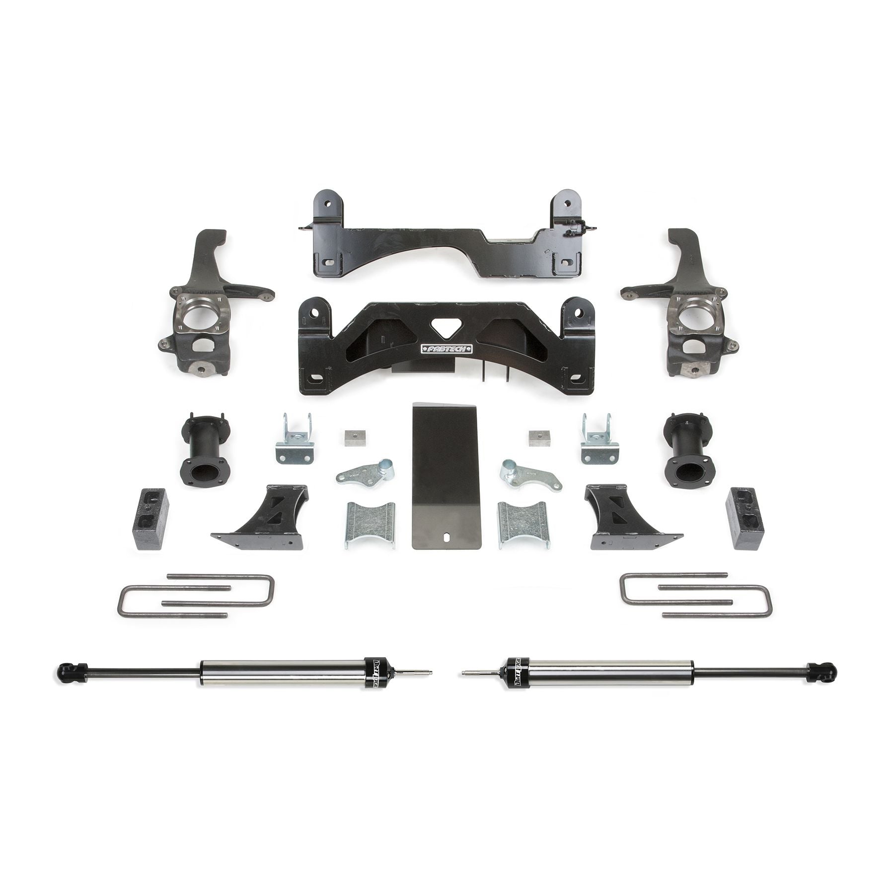 Our Tundra systems feature extended length ductile iron steering knuckles that have been designed to operate within the factory steering geometry. This geometry provides proper turning radius with oversized tires and Wheels. The factory lower control arms are relocated with high arched 1/4in thick steel crossmembers with an integrated differential skid plate for protection against offroad obstacles. The factory front sway bar is retained and utilizes sway bar drops. The Basic system features a heavy duty shock spacer system that retains the stock coilover shocks without disassembly for a factory like ride. This system utilizes a 3in block and u-bolt system for rear lift. Includes rear Dirt Logic Shocks.