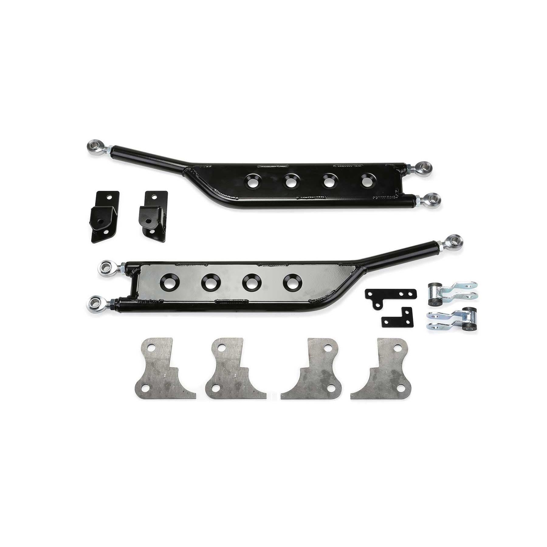 Reduce rear leaf spring axle wrap caused by tall lift blocks, high torque engines and oversized tires with Fabtech's heavy duty Traction Bars. These Traction Bars utilize a shackle design on one end to allow movement with the arc of the leaf spring travel. This provides a non binding, smooth highway ride yet still provides positive resistance to torque loads. Tubular construction with adjustable heims. Dimple die side plate for strength. Floating shackle at frame provide smooth highway ride. Controls rear leaf spring wrap from high torque engines.