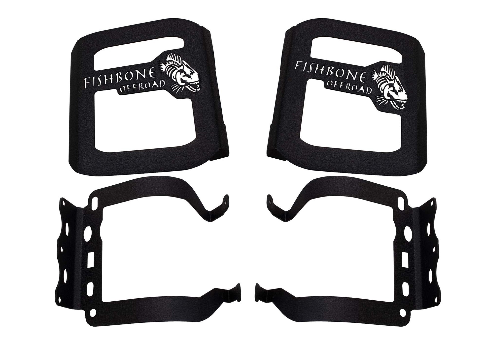 Constructed from a blend of durable steel and aluminum, these Jeep JL tail light covers are a stylish solution to safeguarding your JL's rear lights. These guards are designed to easily mount over your OEM tail lights, offering a robust shield that defends against the hazards of off-roading, including menacing trees, rocks, and the occasional encounter with less-than-attentive drivers. While providing superior protection, these tail light guards also make a bold style statement. A textured black powder coat finish ensures their longevity, and they proudly display the Fishbone brand when lit by your tail lights after dark. Keep your Jeep's rear lights looking pristine and your Jeep looking cool with Fishbone Offroad's JL Tail Light Guards – an ideal blend of style and protection.