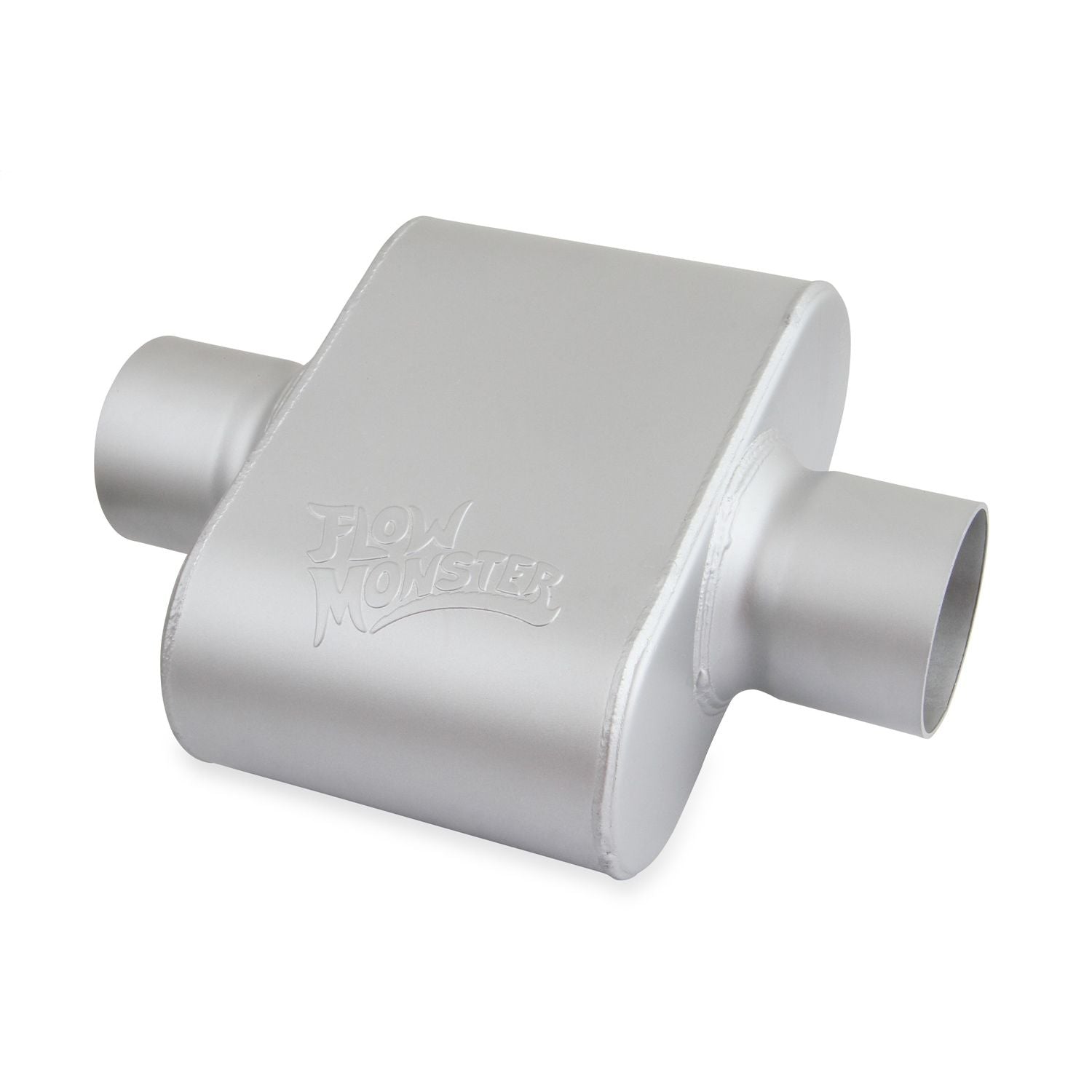 Unleash your Monster with FlowMonster chambered mufflers. Hidden beneath your ride lies a powerful creature destined to dominate. FlowMonster chambered mufflers create an aggressive exhaust note giving a powerful voice to your car/truck/SUV. FlowMonster mufflers are constructed of 16-gauge aluminized steel and are 100% MIG welded for maximum strength and durability. The chambered design cancels out unwanted frequencies with no packing producing an aggressive exhaust note that will not change with time. FlowMonster mufflers are coated with high heat resistant silver paint for an aggressive look under your car. Here the Roar with FlowMonster!