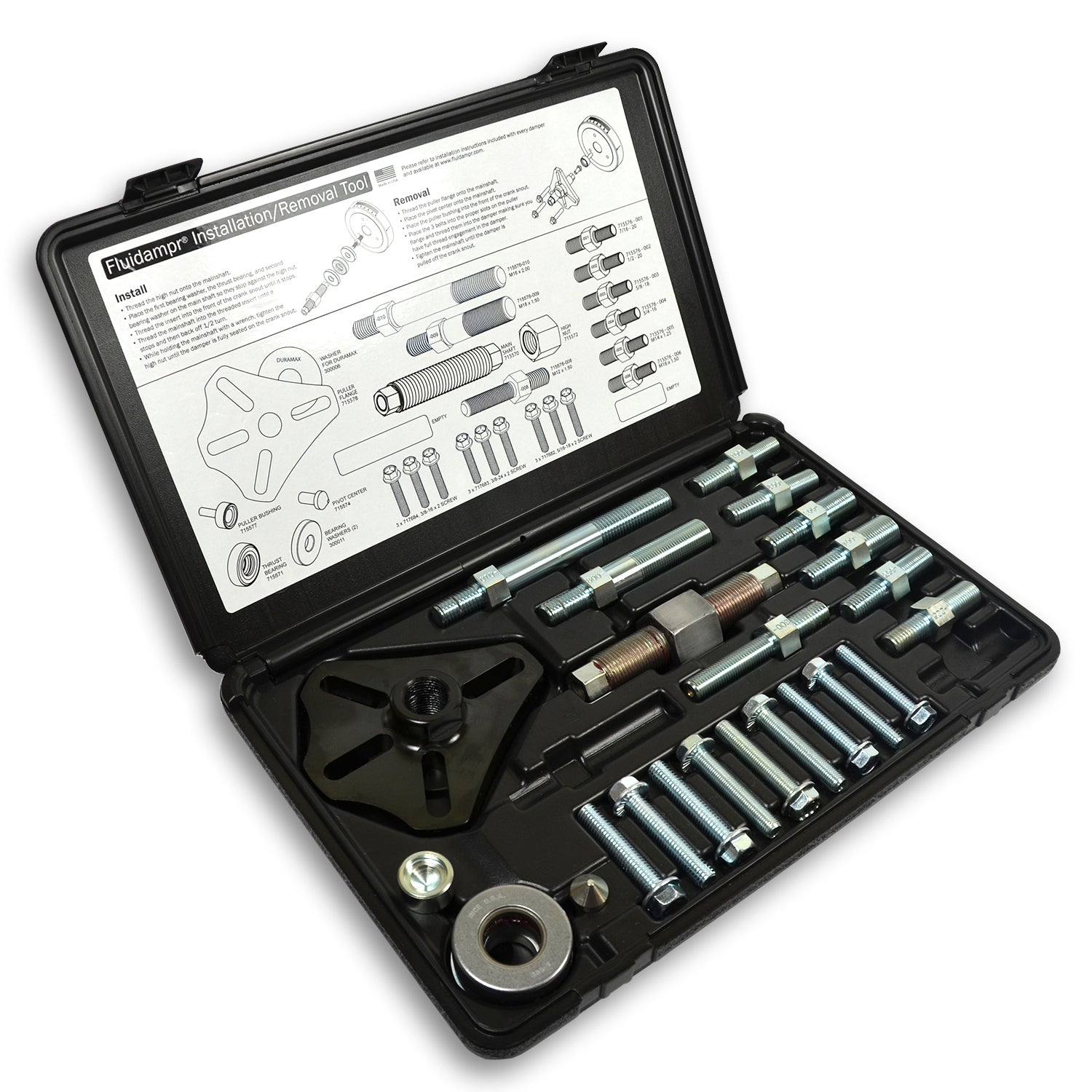 Proper harmonic balancer removal and press-fit installation is critical to quality craftsmanship. The Fluidampr Professional Harmonic Damper Puller / Installer tool kit is suitable for daily engine builder and service center use. Puller features a premium bushing and pivot center tool with heavy-duty flange plate for smooth damper removal. Accompanying stud sizes include 3/8-16x2, 3/8-24x2, and 5/16-18x2 for a wide variety of applications. Installer features a robust main shaft with large diameter washers, thrust bearing, and nine threaded adapters to provide even damper installation. Adapters fit most popular crankshaft snouts, including GM Duramax, LS and LT series engines. Sizes include: 7/16 - 20, 1/2 - 20, 5/8 - 18, 3/4 - 16, M12 x 1.50, M14 x 1.25, M16 x 1.50, M16 x 2.00, and M18 x 1.50. Puller flange, installer main shaft and adapters are CNC precision machined from 4140 hardened high strength steel with a corrosion resistant chromate finish. Packaged in a durable injection molded case for easy organization and storage. Made in USA.