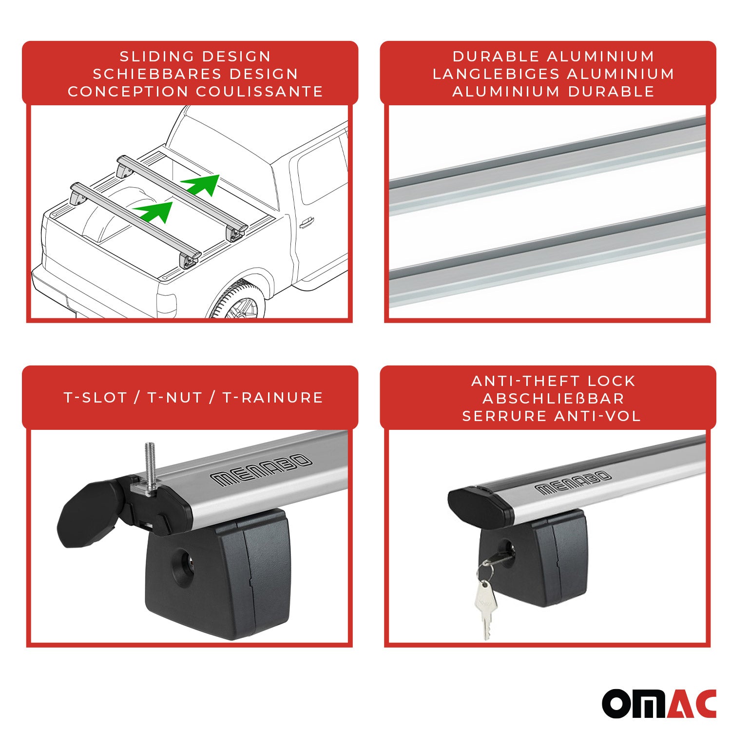 Enhance your truck's functionality with the Menabo Truck Rack System Kit. This all-inclusive kit provides sturdy and secure support for your cargo. Featuring truck bed crossbars with a large, flat aluminum profile and grooving for T-System bolts, it ensures compatibility and easy installation.