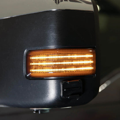 Sequential Turn Signal. These mirror lights also add a sequential turn signal. Every time the turn signal is activated the amber LEDs activate in a sweeping pattern for a premium appearance and increase visibility to other drivers on the road. When the turn signal is done the LEDs will return to cool white with the parking lights.