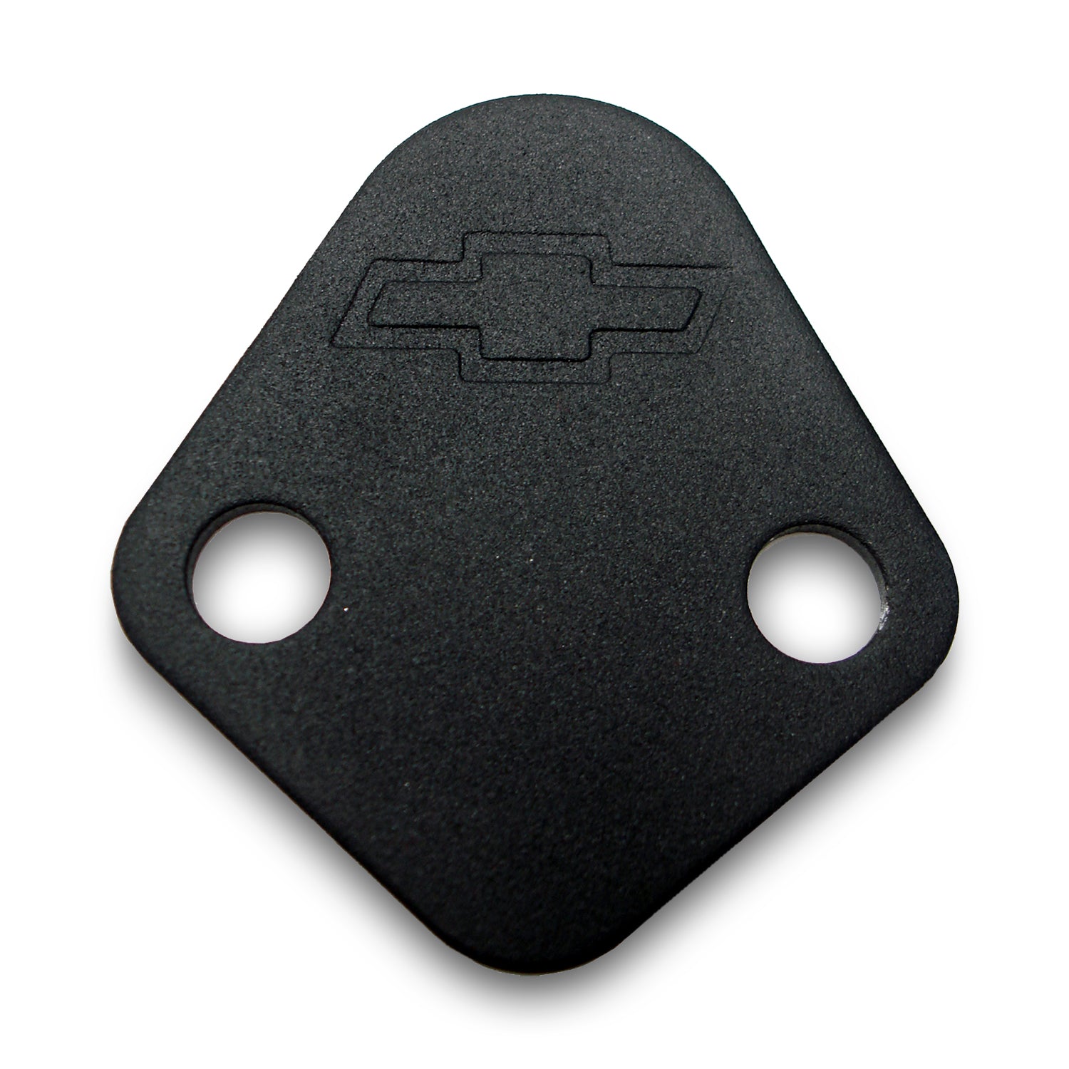 Premium Black Crinkle Fuel Block-Off Plate. Stamped with the handsome Chevrolet Bowtie. For use on Big Block Chevrolet V8s.