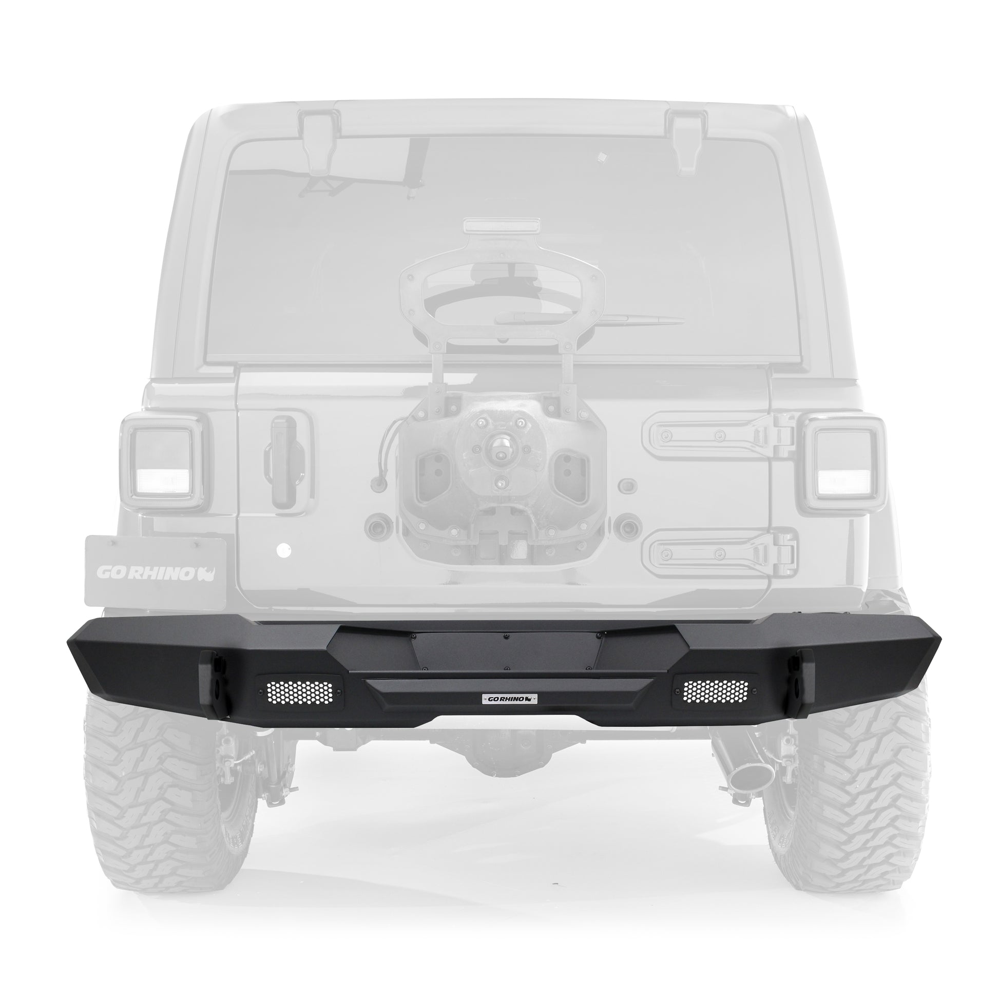 Part of Go Rhino's famous Jeep Bumper family of products. Go Rhino’s Trailline® Full Width Rear Bumper for Jeeps complements the Trailline front bumper with the same care for fit, function and style. The shell is CNC laser cut and formed 3/16” thick steel with fully welded, hand finished seams and has provisions for the installation of two additional cube lights. Patented Rhino Horn shackle mounts can fit 7/8” D-rings. Installation is easy with no drilling or cutting required. The Trailline rear bumper is compatible with the factory hitch. The Trailline rear bumper is compatible with the factory hitch. Trailline Bumpers come with a Limited Lifetime warranty on materials and construction and a 5 year warranty on the Textured Black Finish.
