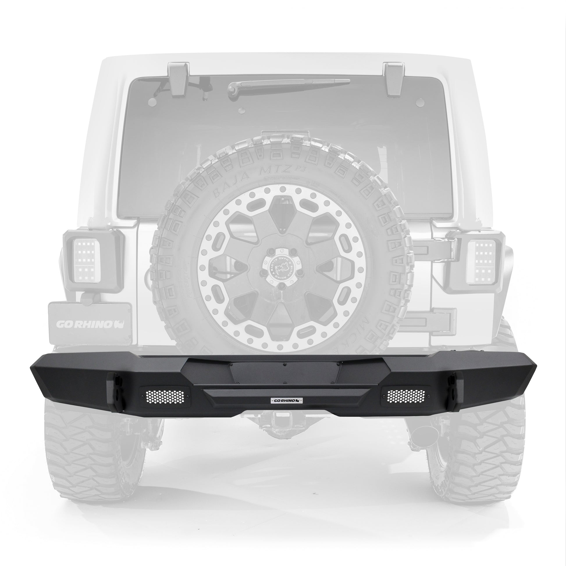 Part of Go Rhino's famous Jeep Bumper family of products. Go Rhino’s Trailline® Full Width Rear Bumper for Jeeps complements the Trailline front bumper with the same care for fit, function and style. The shell is CNC laser cut and formed 3/16” thick steel with fully welded, hand finished seams and has provisions for the installation of two additional 2x6 Flush mount lights. Patented Rhino Horn shackle mounts can fit 7/8” D-rings. Installation is easy with no drilling or cutting required. The textured black powder coat finish comes with a 5-year limited warranty. The Trailline rear bumper is compatible with the factory hitch. The Trailline rear bumper is compatible with the factory hitch. Trailline Bumpers come with a Limited Lifetime warranty on materials and construction and a 5 year warranty on the the textured black finish.