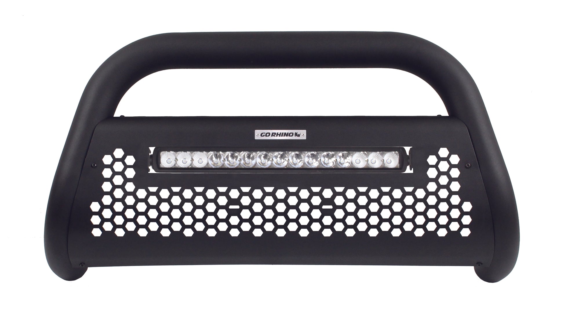 Go Rhino's RC2 LR Bull Bars offer updated styling and the ability to combine today’s popular LED lights with front-end protection. The 3" diameter tubular steel frame features a galvanized steel skid plate with a stylish hexagonal cut out pattern. Different styles are available with light mounts for one 20" single row light bar, two 3" cube lights or four 3" cube lights. In addition, all RC2 LR Bull Bars have pre-drilled light mount holes across the center crossmember. The RC2 LR is available as a standalone; as a kit that includes vehicle-specific mounting brackets; or as a kit that includes both mounting brackets and LED lights. Installation is easy with no drilling required. RC2 LR Bull Bars come with a Limited Lifetime warranty on materials and construction, a 5 year warranty on the Textured Black Finish and a 1 year warranty on the electrical compoenents.