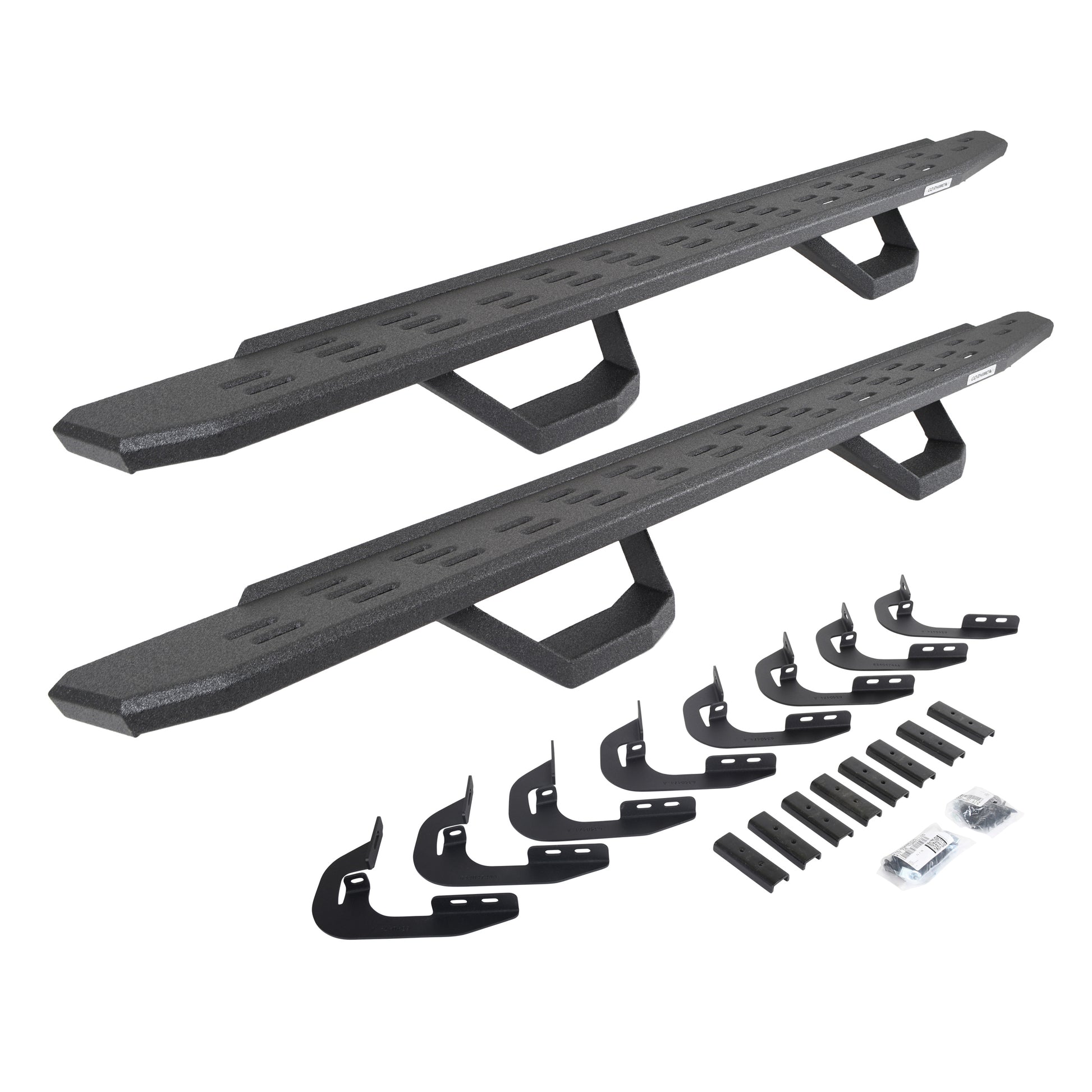 Meet the third edition of the legendary Go Rhino RB Series of running boards: the RB30. The RB30 is the next generation of Raptor-inspired design that will make your truck, Jeep, Bronco or SUV stand out from the crowd. With its aggressive, stylish appearance, this cab-length, bolt-on side step provides maximum traction and features an open flow-through design that prevents mud, ice, and snow from accumulating. The corrosion-resistant 16-gauge steel step mounts tightly to factory mounting points along the lower rocker panel, providing plenty of clearance for off-roading, and it’s strong enough to support 300 lbs. per stepping surface for 600 lbs. per board. Matching drop steps will make entering and exiting lifted vehicles even easier. The RB30 Running Board is 7” wide for most its length before it tapers (compared to 5” wide for the Slim Line version). All RB Series Running Boards are available in Textured Black Powder Coat or Protective Bedliner finish, made in North America and offer a limited lifetime warranty against manufacturer and material defects, with a 5-year warranty on the finish.