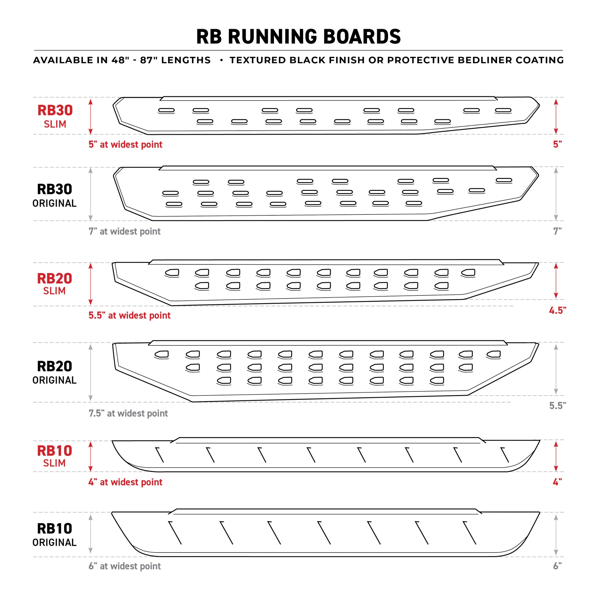 The legendary RB Series of cab length running boards from Go Rhino will make your truck, Jeep or SUV stand apart from the crowd. These, aggressive, stylish bolt-on side steps take their visual inspiration from the Ford Raptor but are made for more than just looks. The RB30 running boards have perforated holes punched into the surface of the step, which gives maximum traction and prevents mud, ice, and snow from accumulating. The corrosion-resistant 16-gauge zinc coated steel steps are mounted high and tight, giving them plenty of clearance for off-road adventures, and are strong enough to support hundreds of pounds. The RB30 is offered in textured black powder coat or rugged, bedliner coating. Hardware and brackets are included and installation on most vehicles will not require drilling. RB30 Running Boards come with a Limited Lifetime warranty on materials and construction and a 5 year warranty on the the Bedliner Finish.