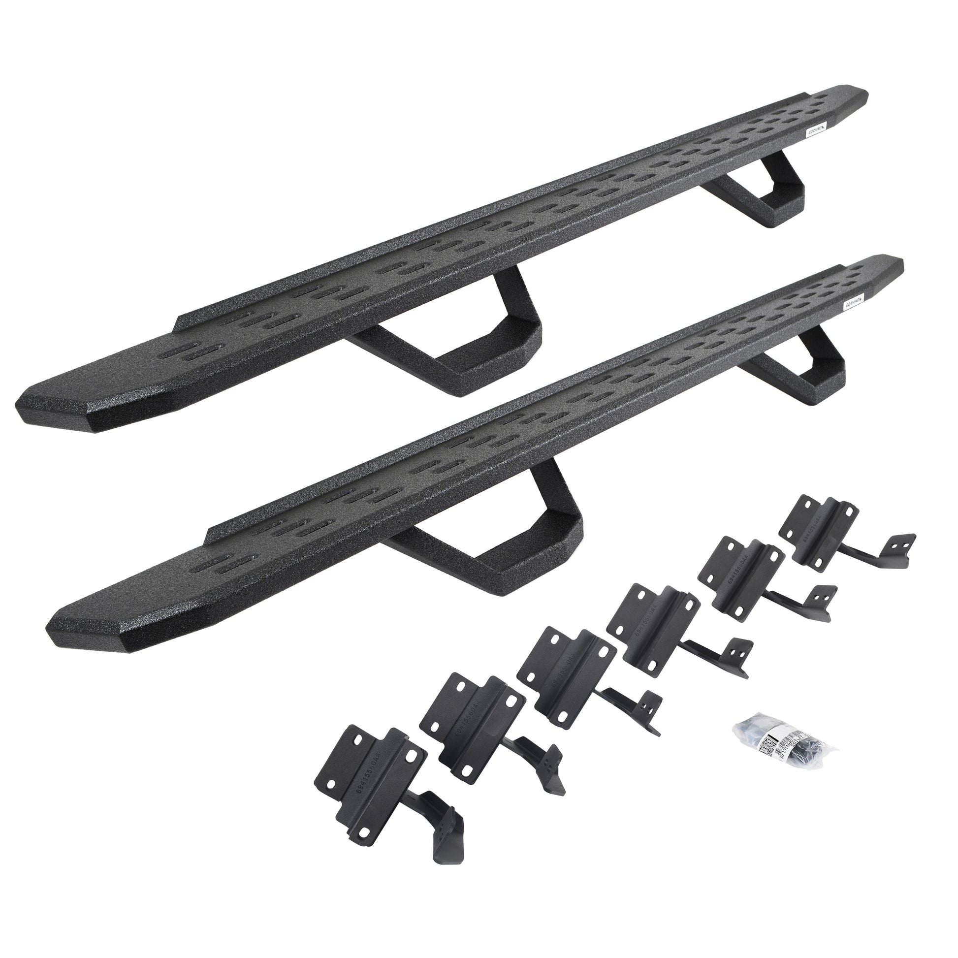 Meet the third edition of the legendary Go Rhino RB Series of running boards: the RB30. The RB30 is the next generation of Raptor-inspired design that will make your truck, Jeep, Bronco or SUV stand out from the crowd. With its aggressive, stylish appearance, this cab-length, bolt-on side step provides maximum traction and features an open flow-through design that prevents mud, ice, and snow from accumulating. The corrosion-resistant 16-gauge steel step mounts tightly to factory mounting points along the lower rocker panel, providing plenty of clearance for off-roading, and it’s strong enough to support 300 lbs. per stepping surface for 600 lbs. per board. Matching drop steps will make entering and exiting lifted vehicles even easier. The RB30 Running Board is 7” wide for most its length before it tapers (compared to 5” wide for the Slim Line version). All RB Series Running Boards are available in Textured Black Powder Coat or Protective Bedliner finish, made in North America and offer a limited lifetime warranty against manufacturer and material defects, with a 5-year warranty on the finish.