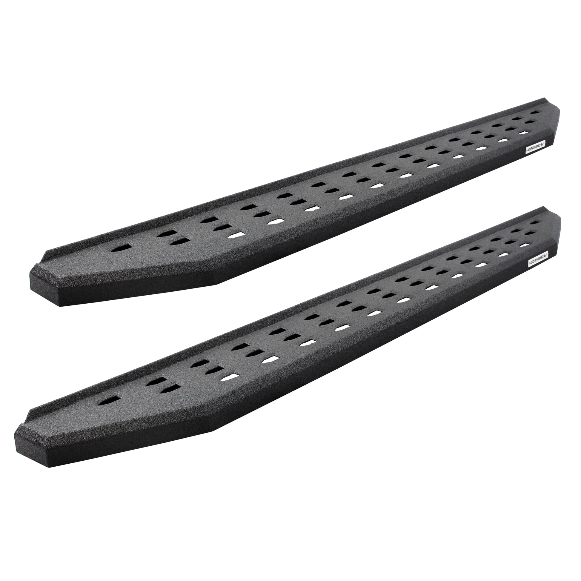 The legendary RB Series of cab length running boards from Go Rhino will make your truck, Jeep or SUV stand apart from the crowd. These, aggressive, stylish bolt-on side steps take their visual inspiration from the Ford Raptor but are made for more than just looks. The RB20 running boards have perforated holes punched into the surface of the step, which gives maximum traction and prevents mud, ice, and snow from accumulating. The corrosion-resistant 16-gauge zinc coated steel steps are mounted high and tight, giving them plenty of clearance for off-road adventures, and are strong enough to support hundreds of pounds. The RB20 is offered in textured black powder coat or rugged, bedliner coating. Hardware and brackets are included and installation on most vehicles will not require drilling. RB20 Running Boards come with a Limited Lifetime warranty on materials and construction and a 5 year warranty on the the Bedliner finish.