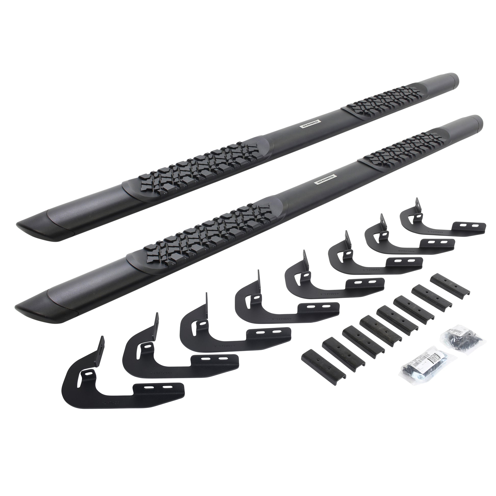 Go Rhino's V3 side steps bring on a sleek, aerodynamic look, the convenience of corrosion-resistant aluminum and strength based on quality engineering and design. Finished with a textured black powder coating, the 5” wide ellipse-shaped boards feature anti-slip polymer step pads with a multi-dimensional tire tread pattern so rain, snow and slush easily drain off and reduce the risk of slipping while stepping up into your vehicle. Each V3 board is fortified with a dual core full length extrusion allowing the board to support up to 300 lbs per step pad (600 lbs per side for 4-door vehicles). Hardware and brackets are included and installation on most vehicles will not require drilling. The V3 Side Steps come with a Limited Lifetime warranty on materials and construction and a 5 year warranty on the Textured Black Finish.