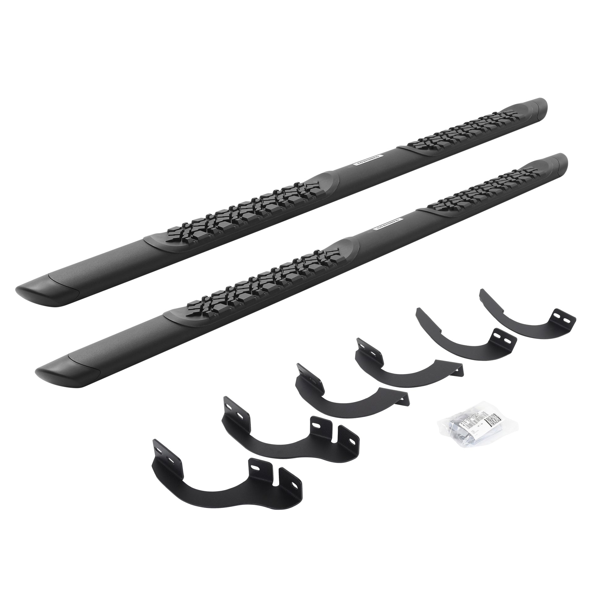 Go Rhino's V3 side steps bring on a sleek, aerodynamic look, the convenience of corrosion-resistant aluminum and strength based on quality engineering and design. Finished with a textured black powder coating, the 5” wide ellipse-shaped boards feature anti-slip polymer step pads with a multi-dimensional tire tread pattern so rain, snow and slush easily drain off and reduce the risk of slipping while stepping up into your vehicle. Each V3 board is fortified with a dual core full length extrusion allowing the board to support up to 300 lbs per step pad (600 lbs per side for 4-door vehicles). Hardware and brackets are included and installation on most vehicles will not require drilling. The V3 Side Steps come with a Limited Lifetime warranty on materials and construction and a 5 year warranty on the Textured Black Finish.